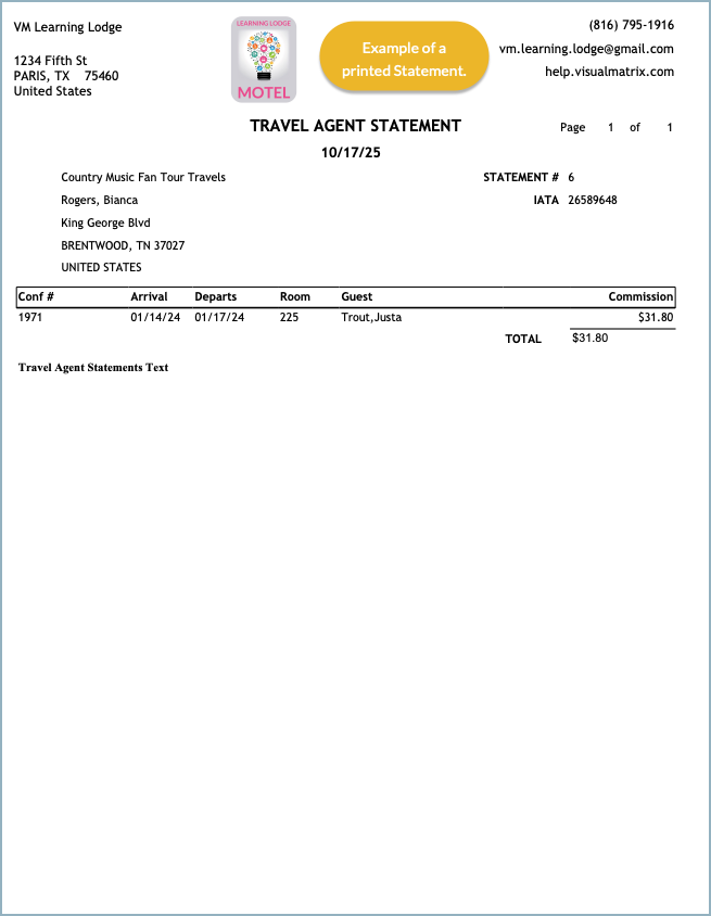 On the right side, example of a Travel Agent commission printed in Statement format. This version provides a detailed summary of commissions included in the payment.