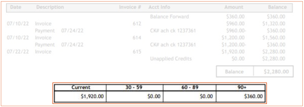 - The Account Info will show any comments entered when posting a payment. Note that any statement will start with the balance forward and end with the unapplied credits (aka Un-invoiced Items).
