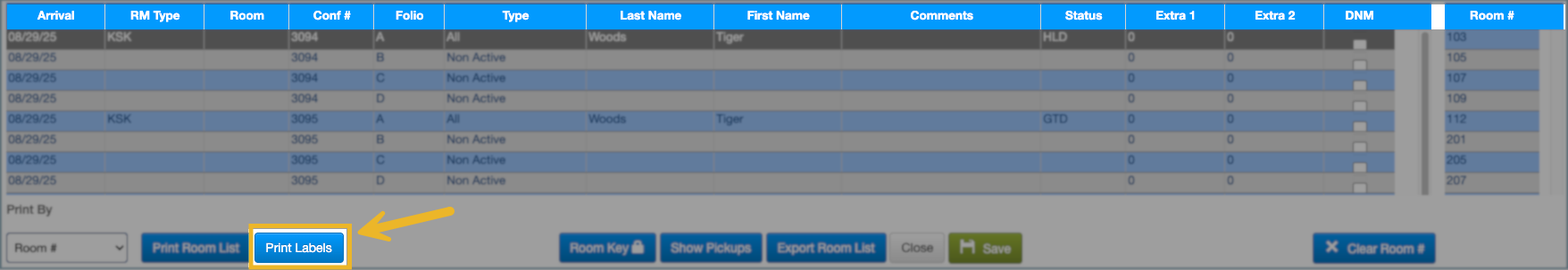 Labels are an efficient way to generate individual guest tags for housekeeping, banquets, or group check-in. From the Rooming List, you can print up to 14 labels per page (in two columns), showing important information like guest name, room type & number, group name & number, and arrival date. Use this feature when you want portable, printable guest tags derived directly from the groupâs rooming list.