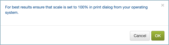 3. A confirmation message appears: "For best results, ensure that scale is set to 100% in the print dialog from your operating system". Click OK to continue.