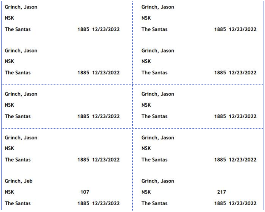 Each page will include up to 14 labels in 2 columns with the following: guest name, room type and number, Group name and number and arrival date.