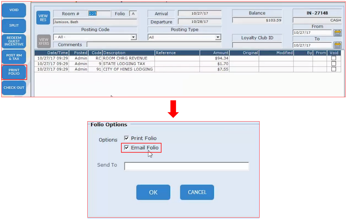 ? Watch Video This feature is meant to print or email departing folios prior to check out. Path: Front Office > Cashiering > Guest Account 1. Choose Preprint Departing Folios from the toolbox on the left 2. Choose one of the 3 options: - All: Will ...