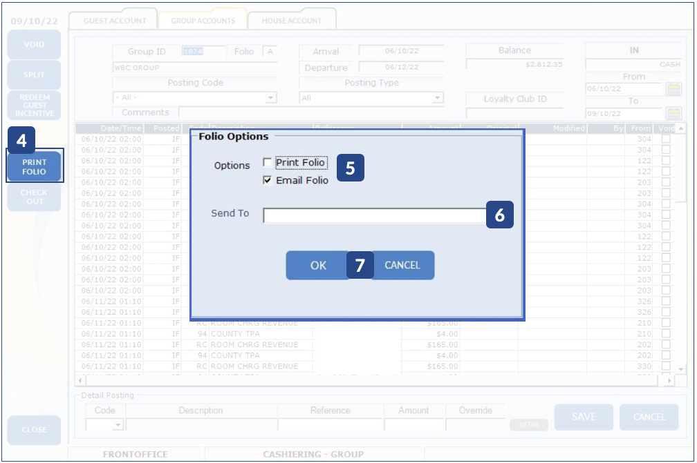 ? Watch Video Path: Front Office > Cashiering > Guest Account > Open a folio. 1. Click Print Folio on the left. 2. Check the print and/or the email box. If you manually enter an email, it will not be saved once the email is sent. 3. Click Submit.