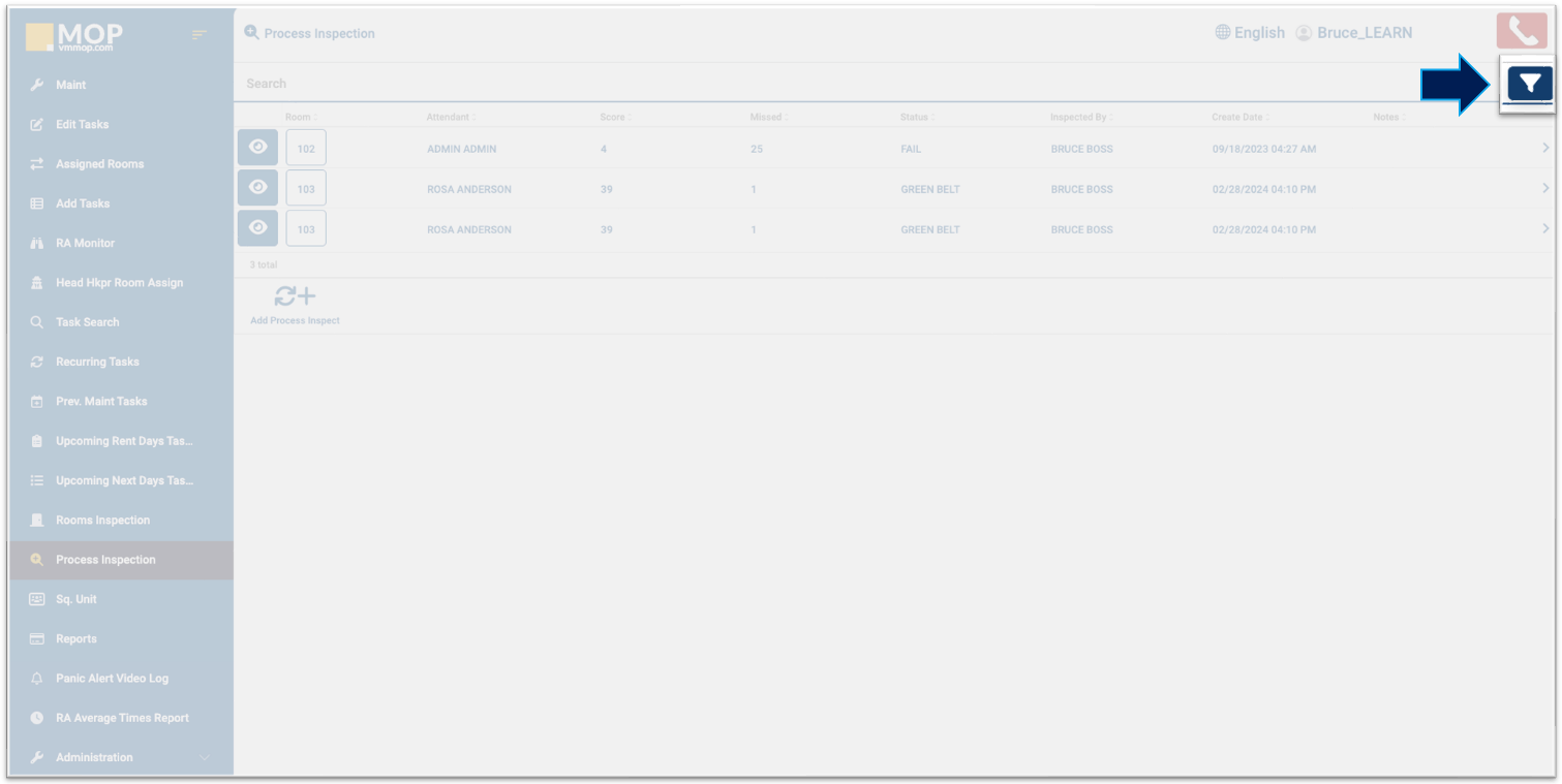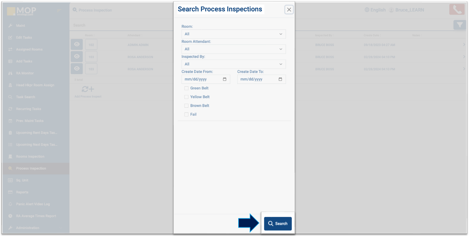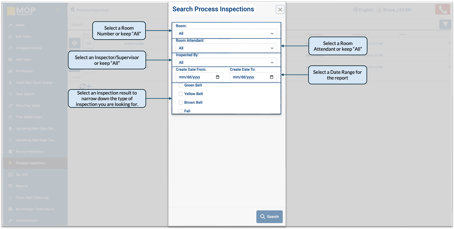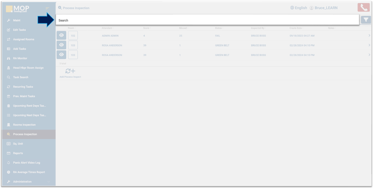 1. This page shows all inspections. You can use the "Search" field to look up inspections by the room attendant being evaluated, not by the inspector. You can also further refine the results...
