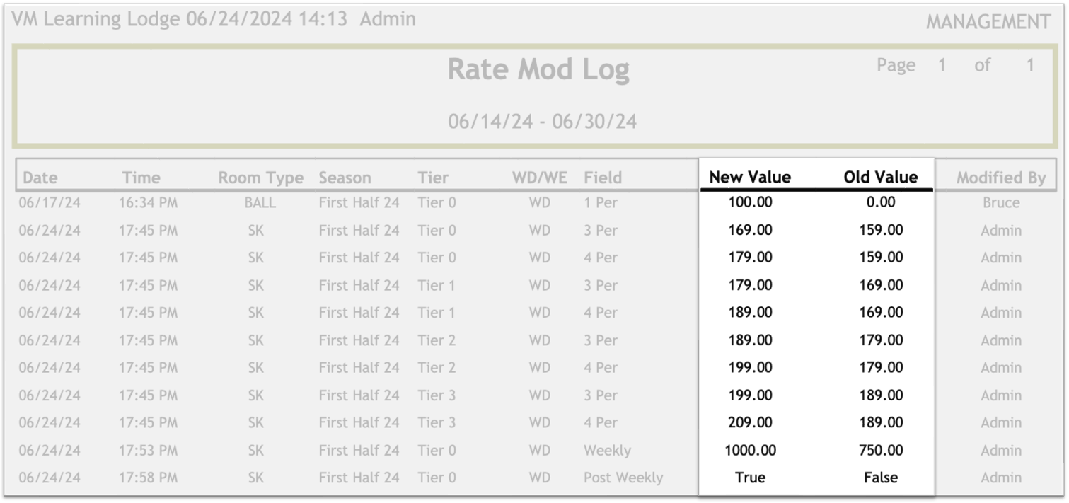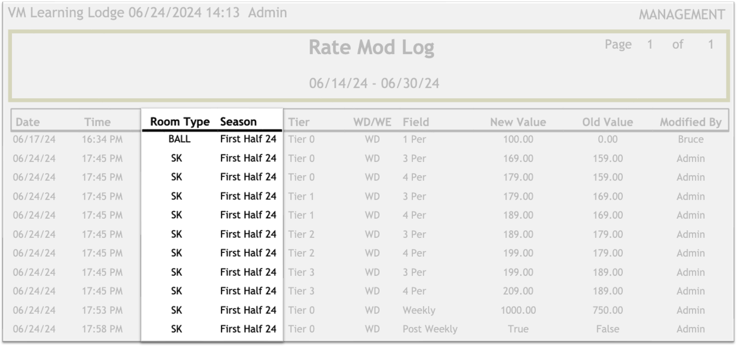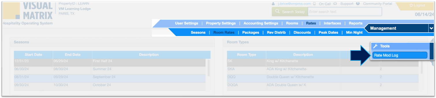 Path: Management > Rates > Room Rates > Tools on the right - Rate Mod Log