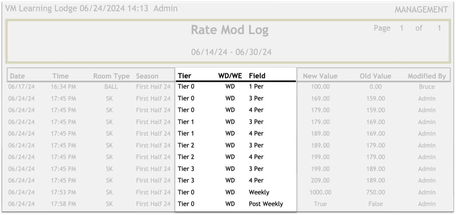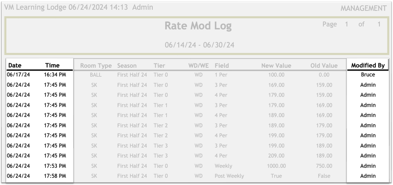 The Rate Mod Log report provides a comprehensive overview of all changes and modifications made to room rates within a specified timeframe. It captures and displays details such as adjustments, updates, and revisions made to the rates configured in the room rate setup page. This report is essential for tracking and auditing changes over time, ensuring transparency and accuracy in rate management within the system.