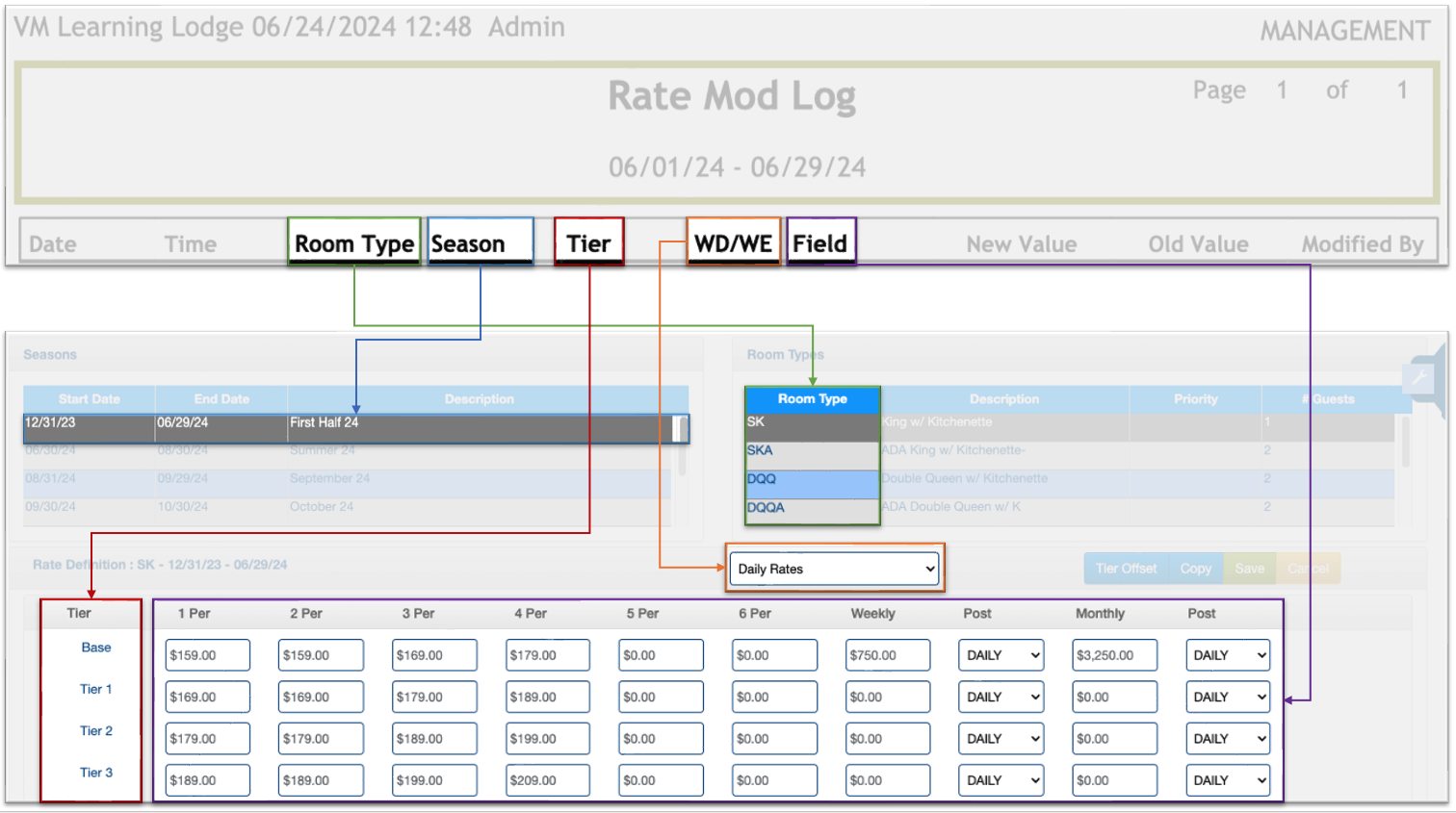 ? Watch Video Path: Management > Rates > Room Rates 1. Select the Season. 2. Select the Room Type. 3. Select Daily Rates (weekdays) or Weekend Rates. 4. Enter the Weekly Rates and their frequency of posting (daily or weekly)*. 5. Enter the Monthly ...