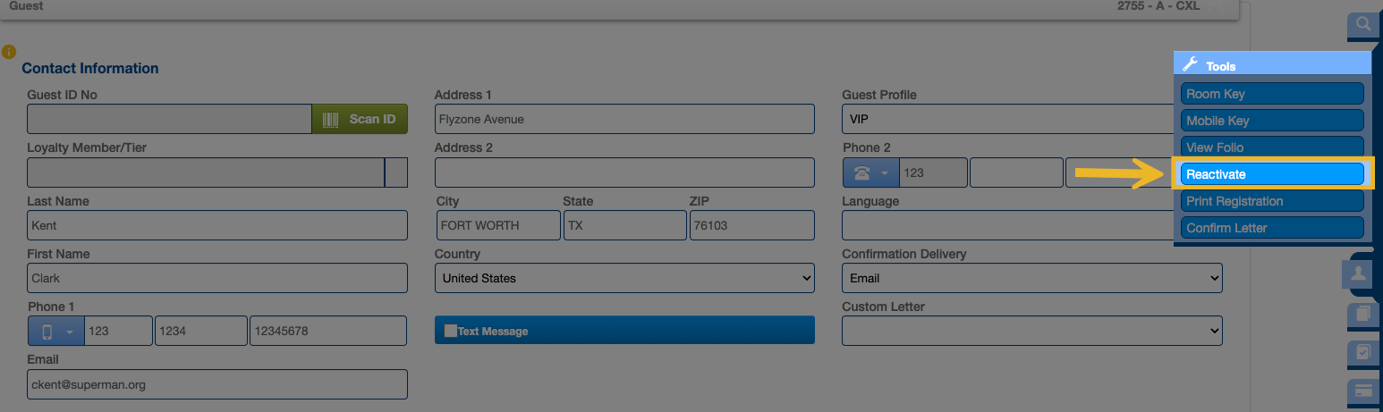 If a reservation has been canceled but you need to bring it back—provided the arrival date hasn’t passed—you can use the Reactivate function. This restores the reservation status (based on its original guarantee method) and updates inventory. Keep in mind, if the booking was made online and originally had a special rate, reactivation may apply the current rate instead.