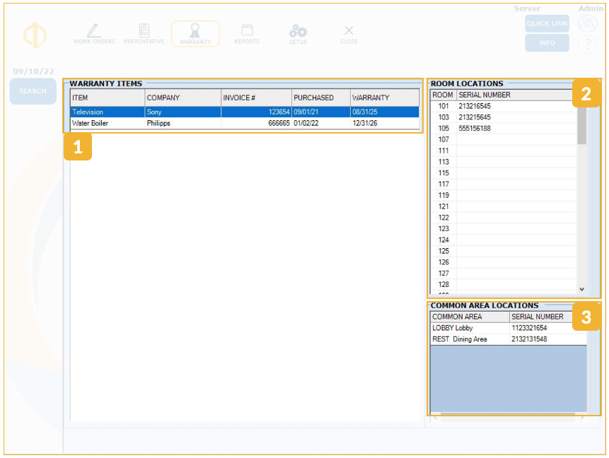 ? Watch Video Path: Maintenance > Set Up > Warranty Items Go to the last empty line and complete with all available information about the item: - Type of item. - Company it was purchased from or Brand. - Contact of the Account Representative. - ...