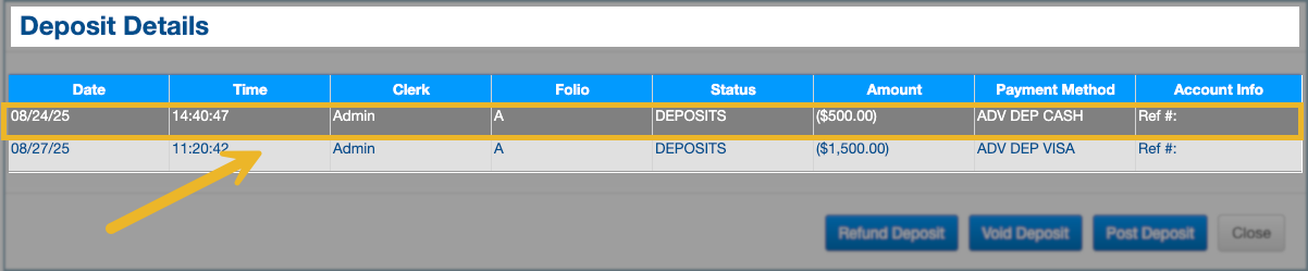 2. In the list, highlight the deposit entry you want to refund.