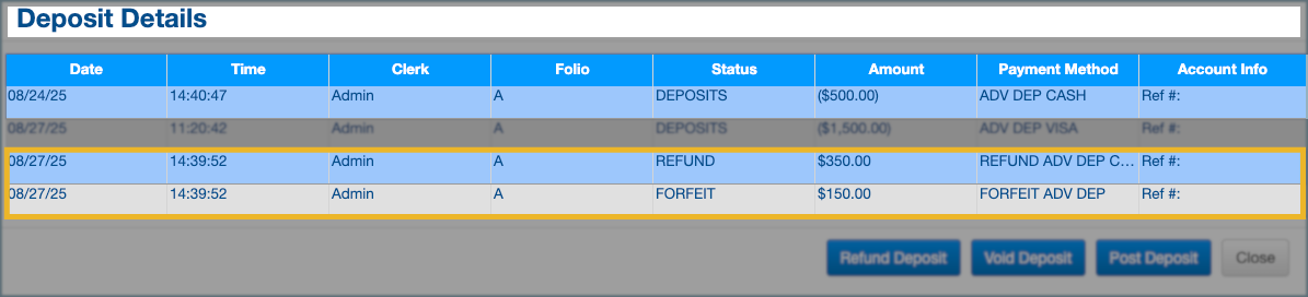 7. Once the refund and/or forfeit is posted, new lines will appear in the Deposit Details window showing each transaction. These lines reflect the amounts refunded and forfeited, along with updated balances for the Group Master Folio.