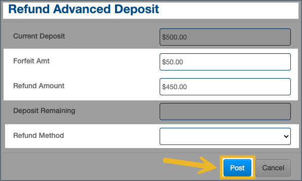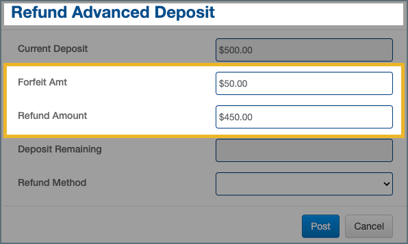 Review both values carefully before posting to ensure the correct amount is refunded or forfeited according to property policy.
