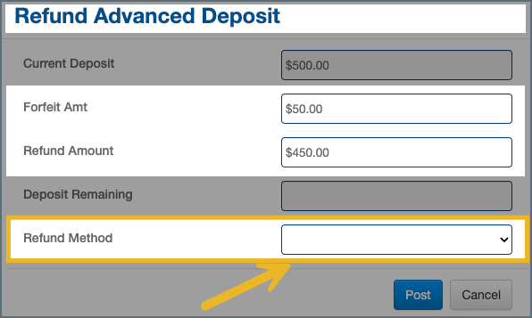 If there is no refund to issue (for example, when the full deposit is forfeited), select Cash as the Method of Refund before posting. This ensures the transaction records are correctly entered in the system.