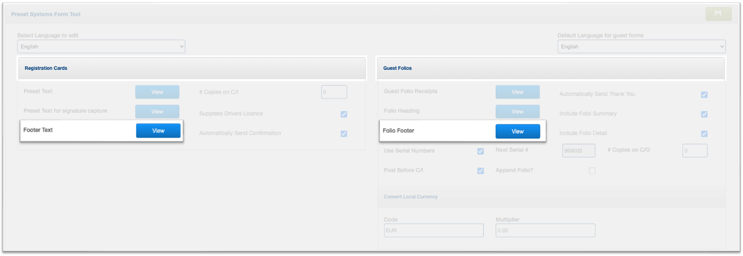 1. In Registration Cards > Footer Text, click on "View" and then in Guest Folios > Footer Text