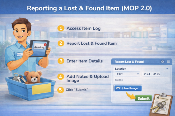 Accurate logging is essential for effective Lost & Found management in MOP 2.0. Properly reporting items ensures they are tracked, organized, and ready for the next steps in the recovery process.