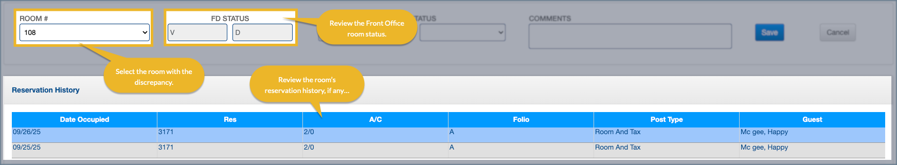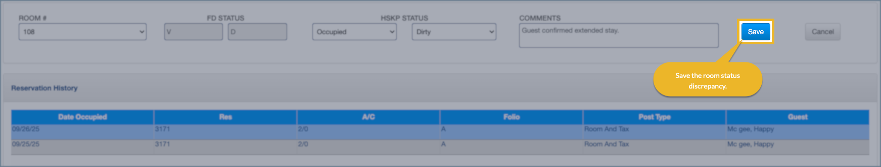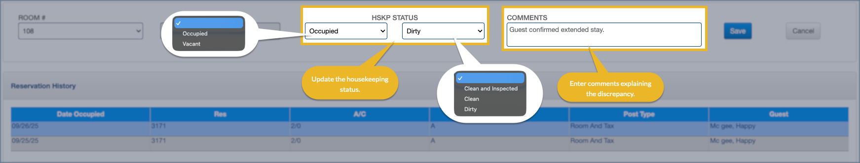 4. Enter comments explaining the discrepancy (for example, “Guest still in room” or “Room cleaned but not updated”).