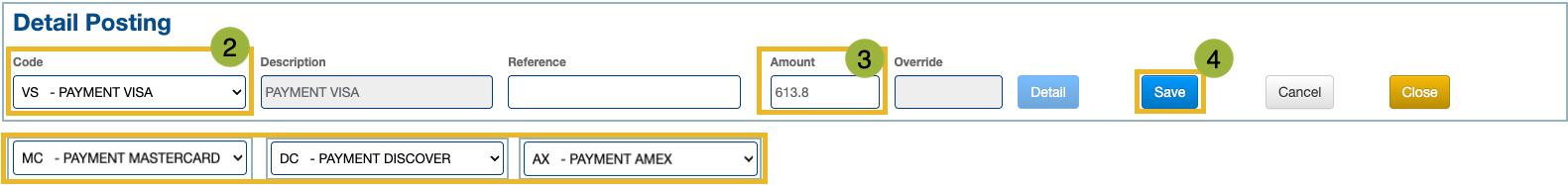 2. In Details Posting, select the correct Credit Card Method of Payment (Visa, Mastercard, Amex, etc.).