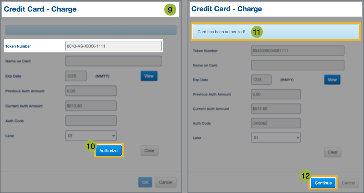 11. If successful, you’ll see a confirmation message such as “Card has been authorized.” Click Continue (12).