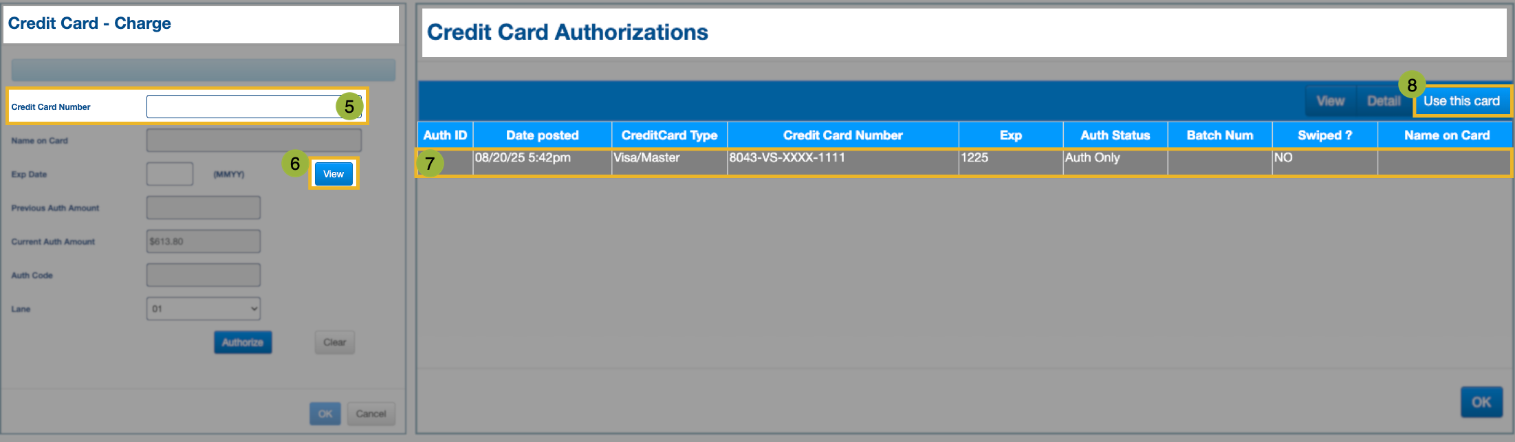 7. Highlight the guest’s credit card and click Use this Card (8).