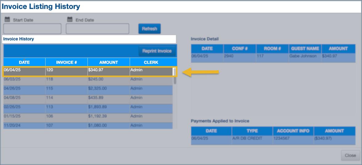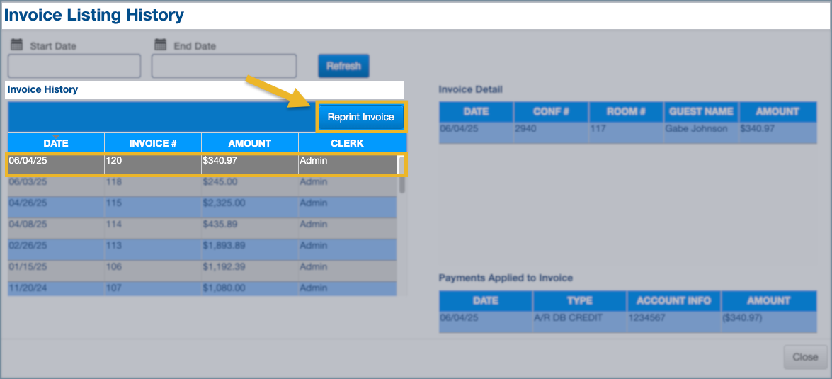 Paid City Ledger invoices can be reprinted from Invoice History after the invoice has been fully settled.