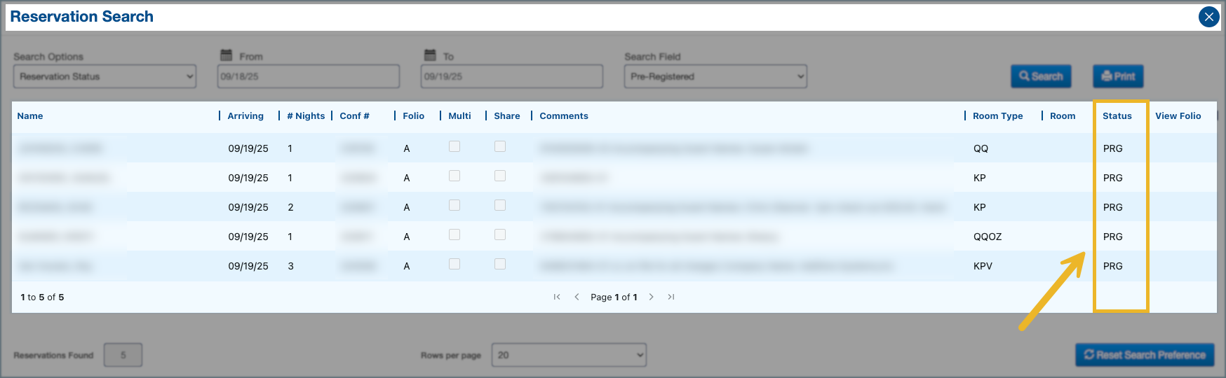 4a. In Visual Matrix, the Arrivals list will include guests who have completed the pre-arrival process in Canary; their reservation status will appear as PRG in VM.