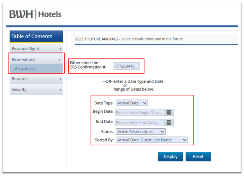 Path: Member Web > Reservations > Arrivals List > Enter CRS Number or Search by Arrival Date