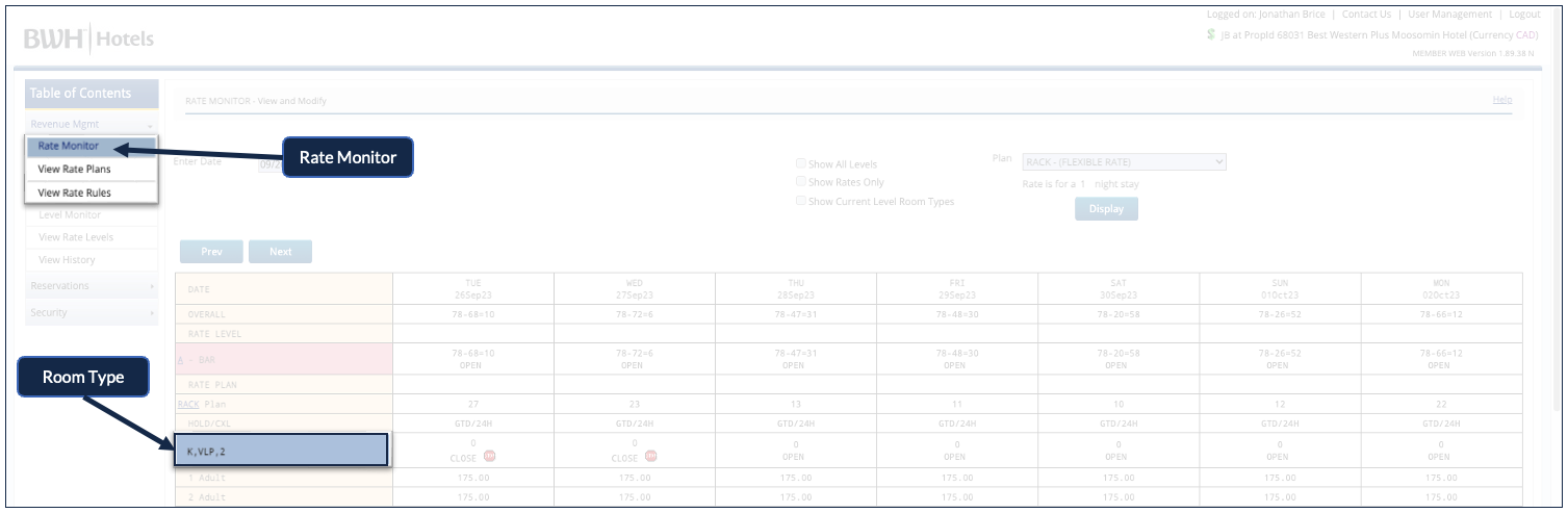 2. Go to Member Web and to the Rate Monitor screen. On this page, our main focus is the room type. If you've recently changed the room type, qualifier, or meal code, any outdated information in the mapping table could block reservations from being processed. Therefore, the first step is to ensure that the information in Visual Matrix is up to date.