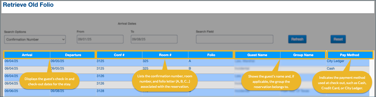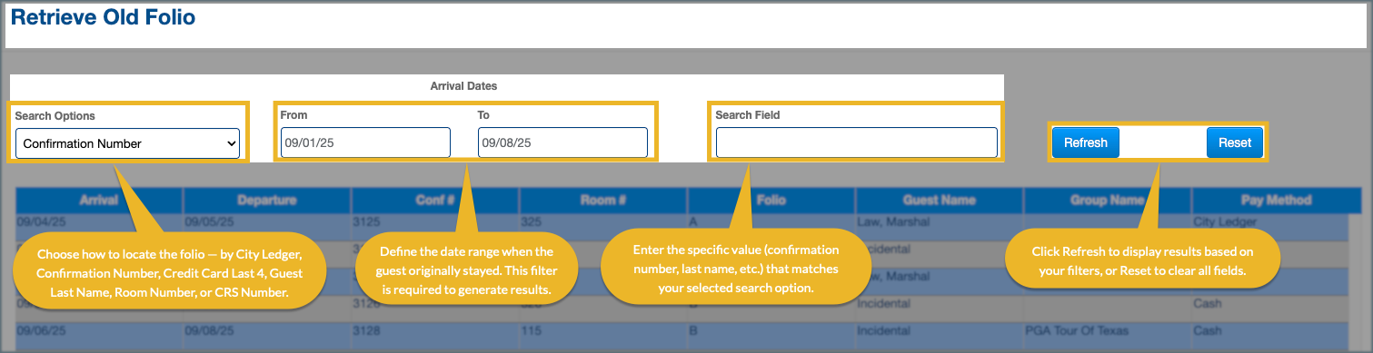 Most search options require adjusting the Arrival Date range to locate the correct folio. However, when searching by Confirmation Number or Central Reservation Number, the system bypasses the date fields and searches the entire database for matching confirmation numbers.