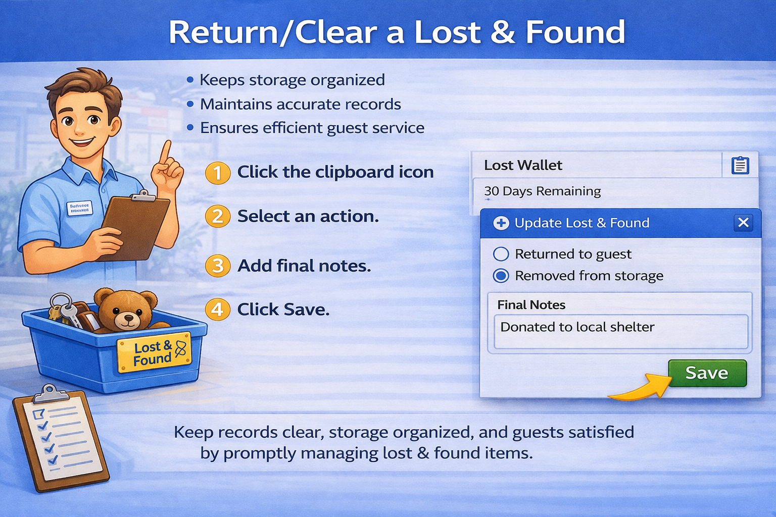 The final step in managing Lost & Found items is ensuring they are either returned to their rightful owner or cleared from storage once they reach expiration. Completing this process properly helps: