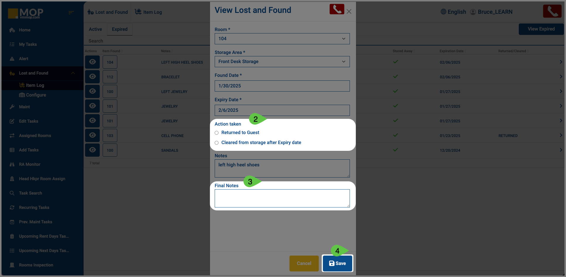 2. Indicate whether the item was returned to the guest or removed from the storage area after its expiration date.