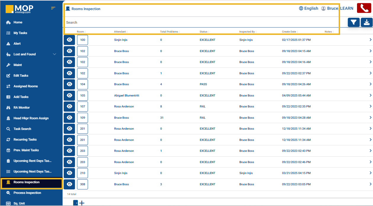 Room Inspection is a workflow in MOP that enables authorized users to: