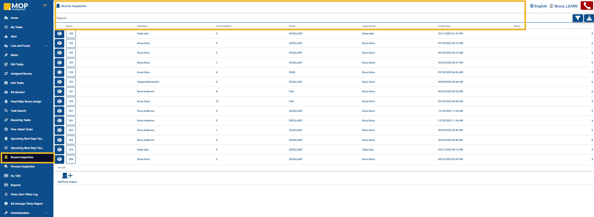 Room Inspection allows supervisors and managers to review completed guest room tasks, verify cleanliness and readiness, and document inspection outcomes directly in MOP. The feature supports quality control, accountability, and reporting by clearly recording inspection results, timestamps, and the user who completed each action.
