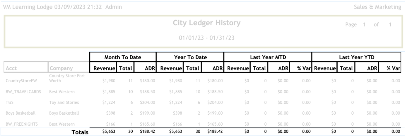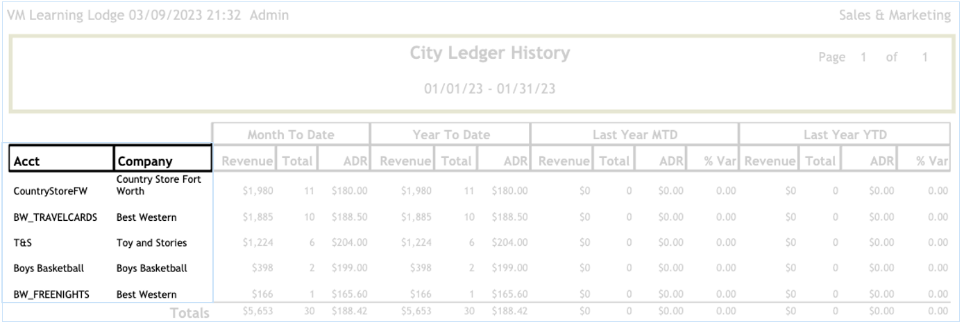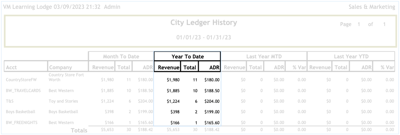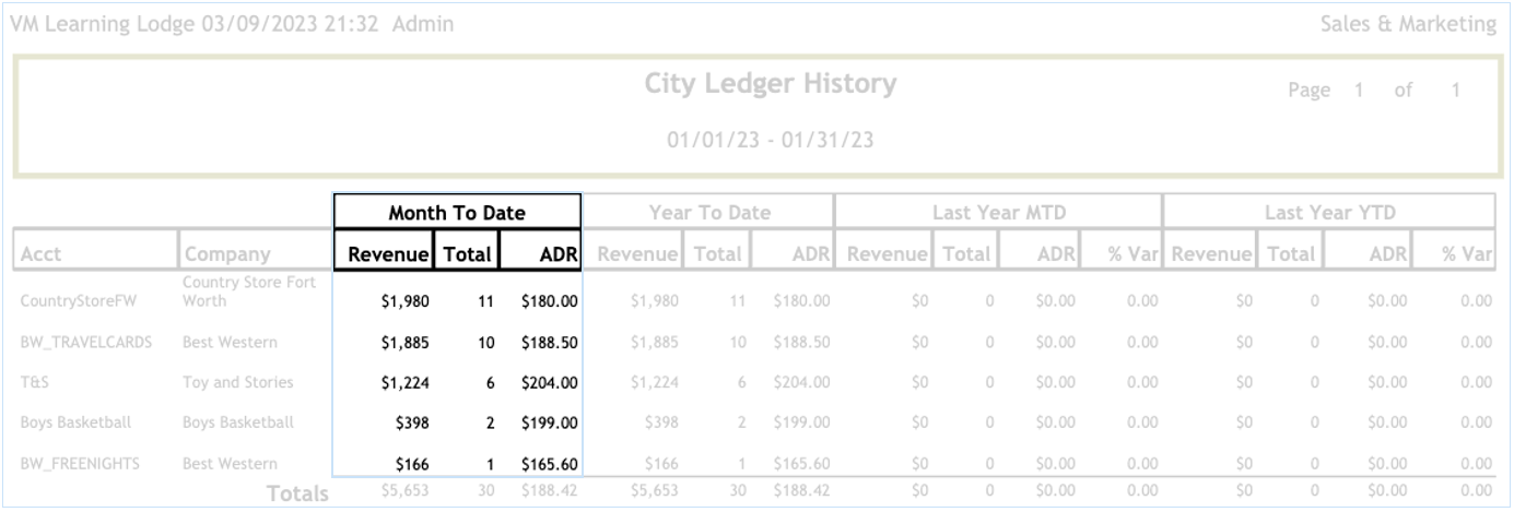 The City Ledger History report will display the number of rooms, revenue generated and ADR for each City Ledger sorted by generated revenue.