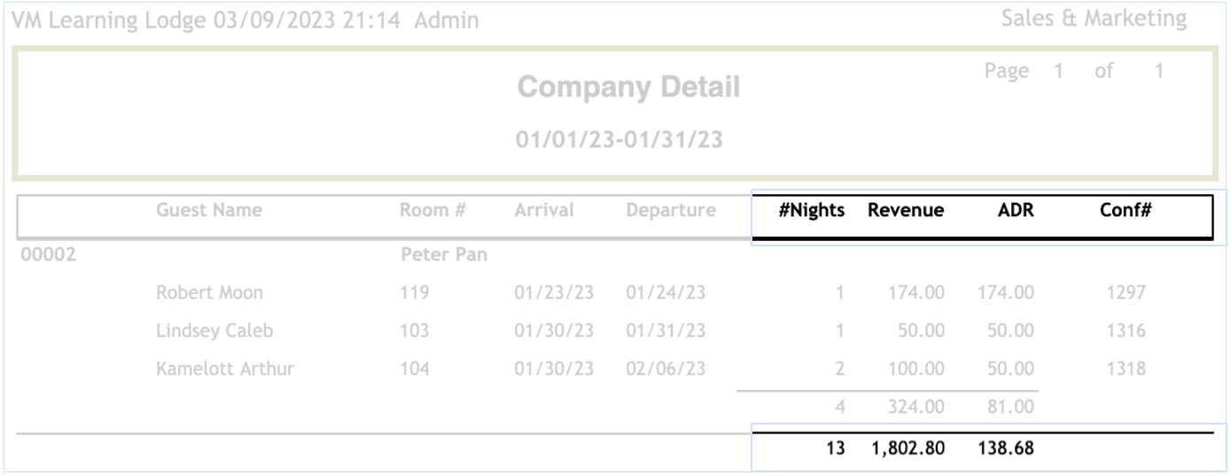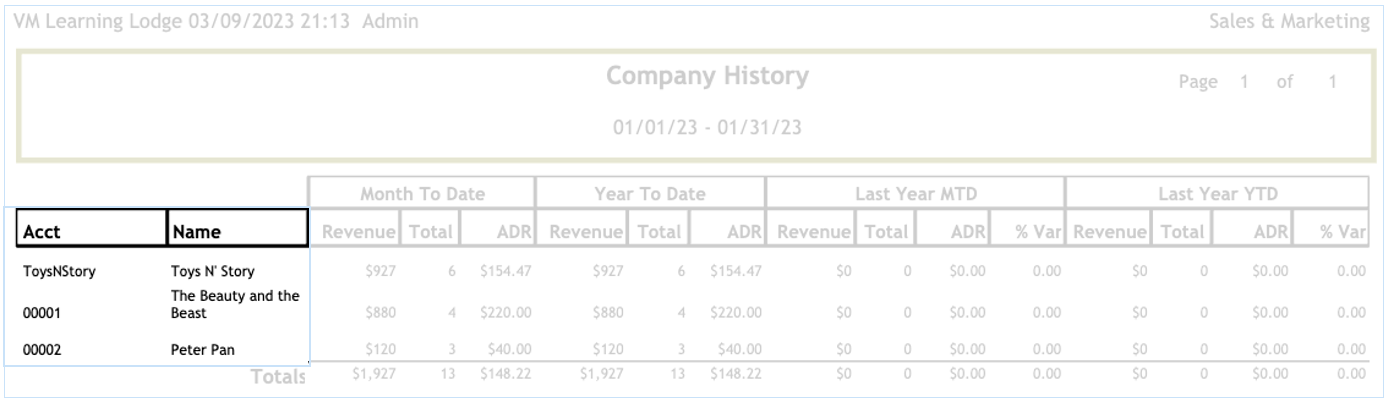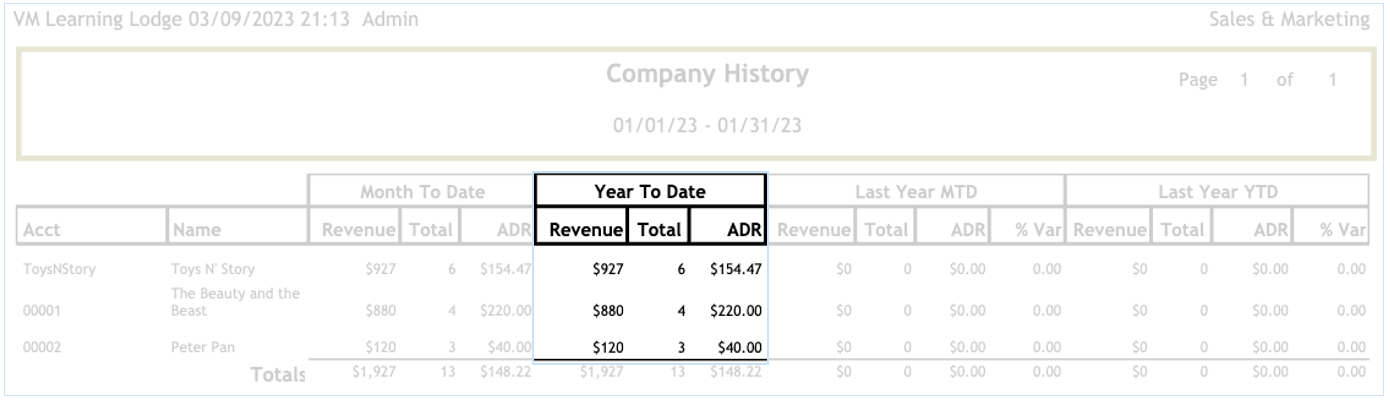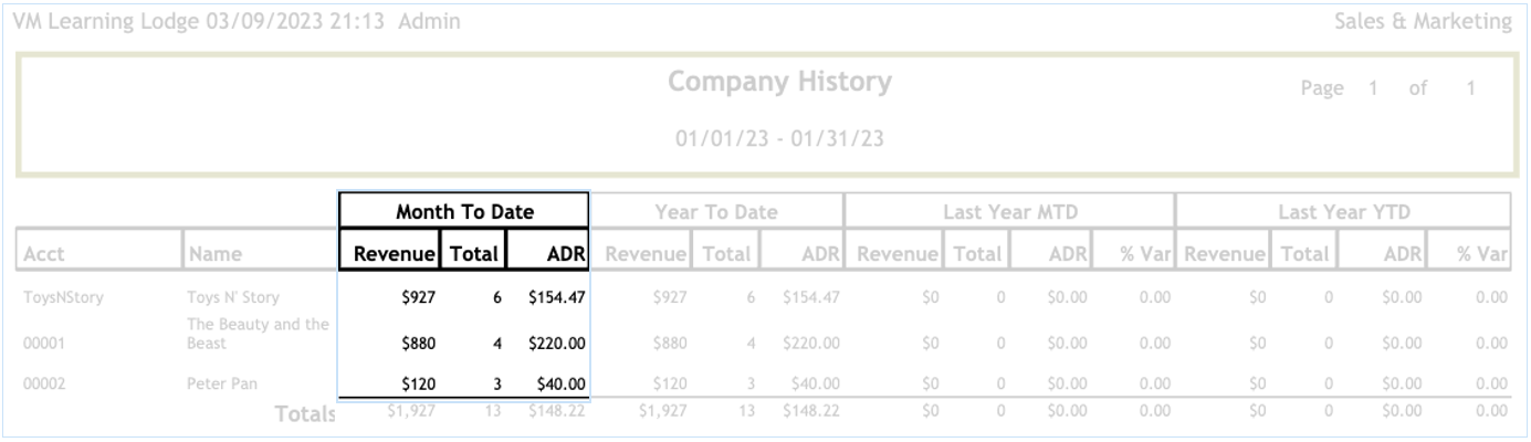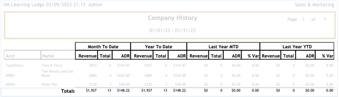 The Company History report will display the number of rooms, revenue generated and ADR for each Company sorted by generated revenue.