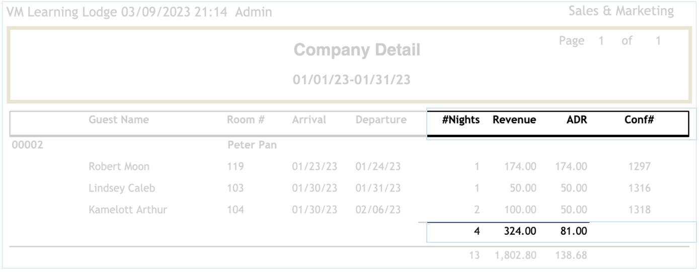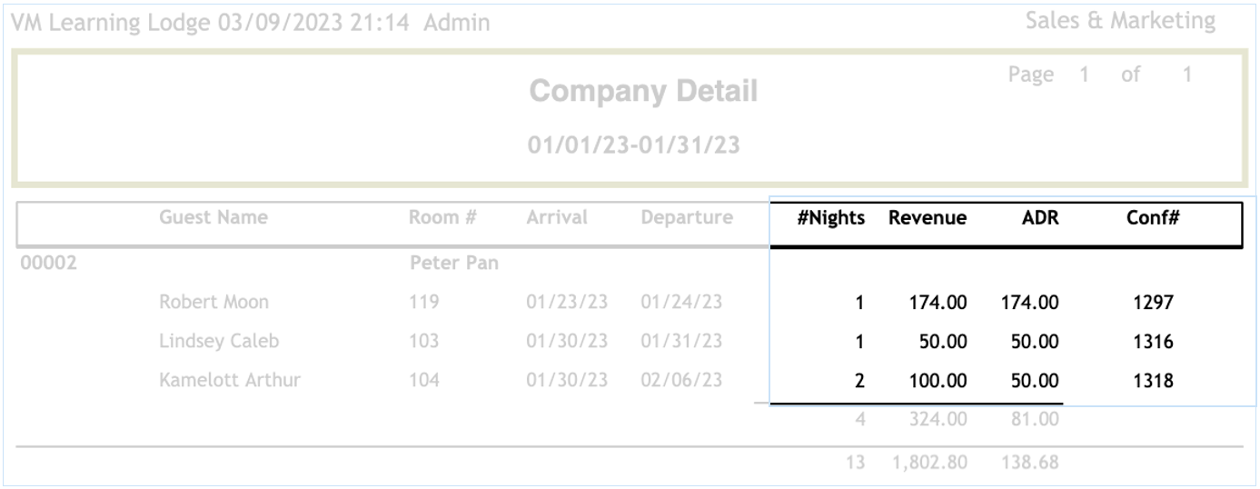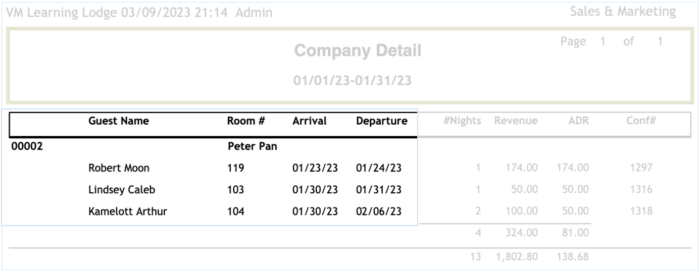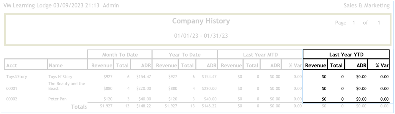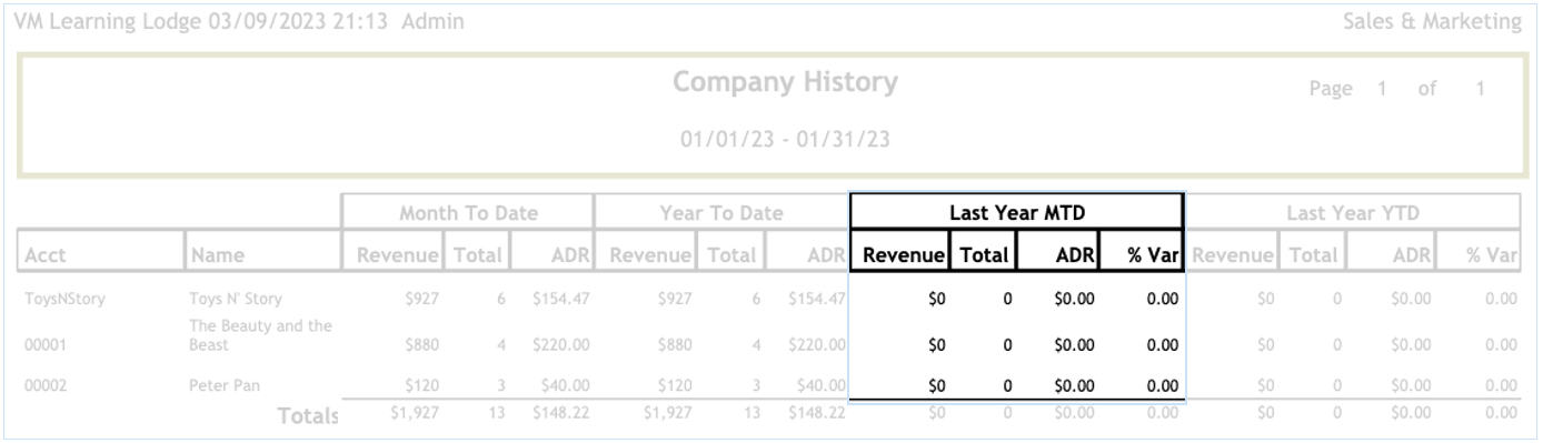 The Company History report will display the number of rooms, revenue generated and ADR for each Company sorted by generated revenue.