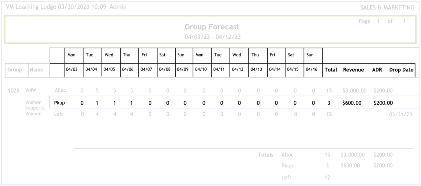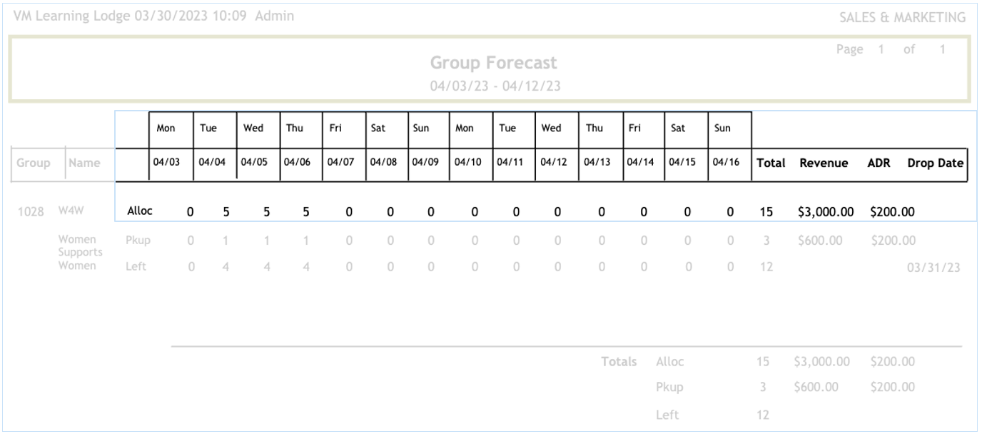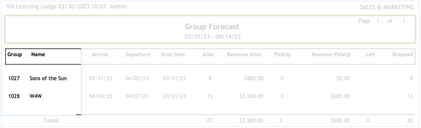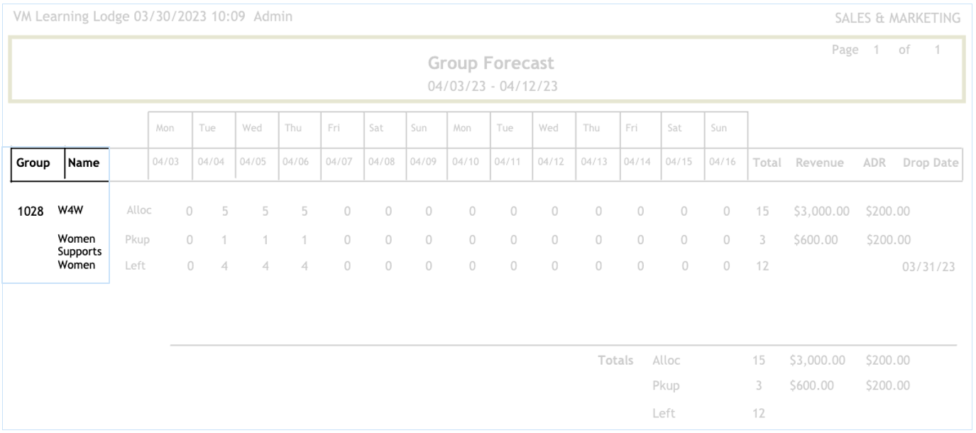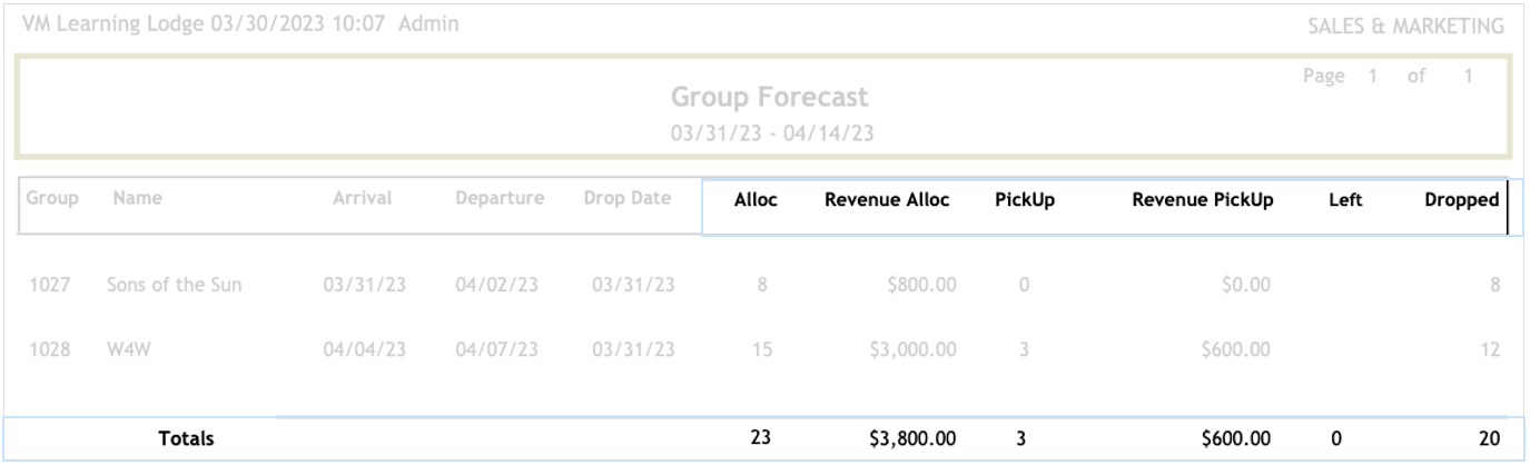 The Group forecast report will display a recap of each group currently booked in the system.
