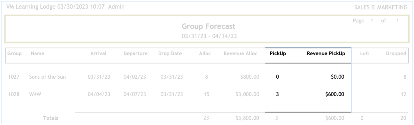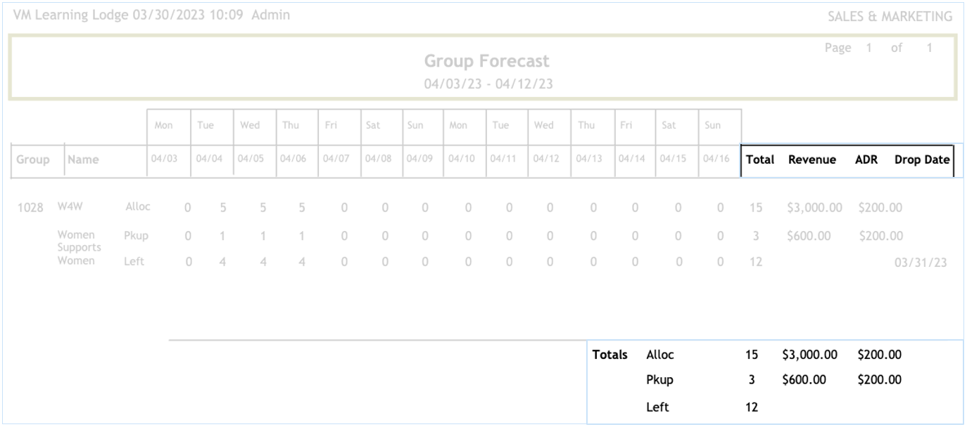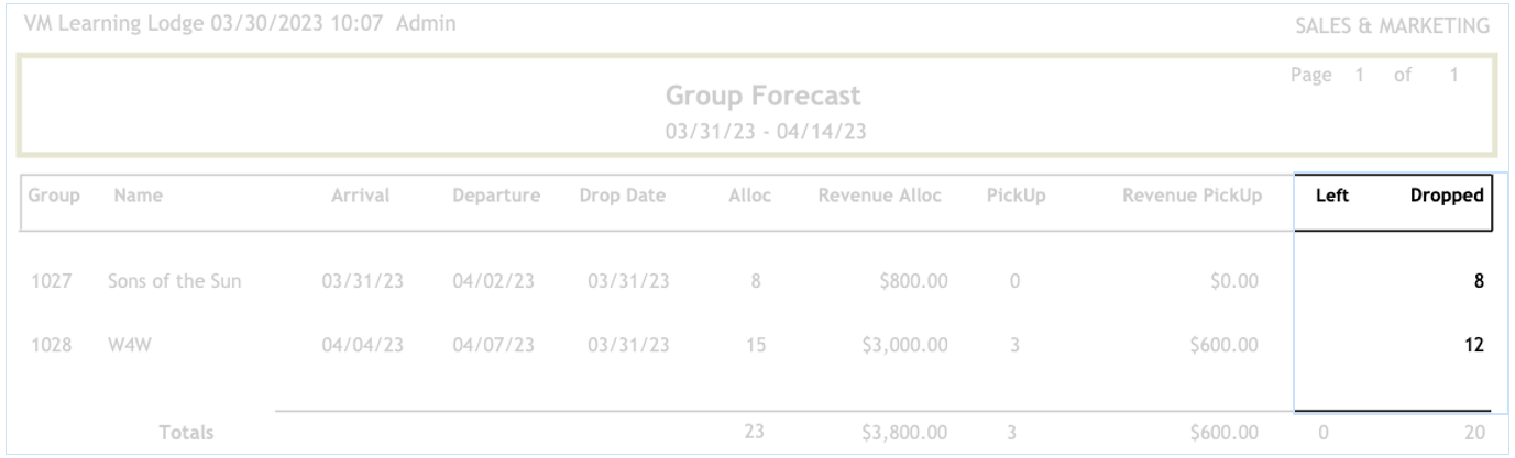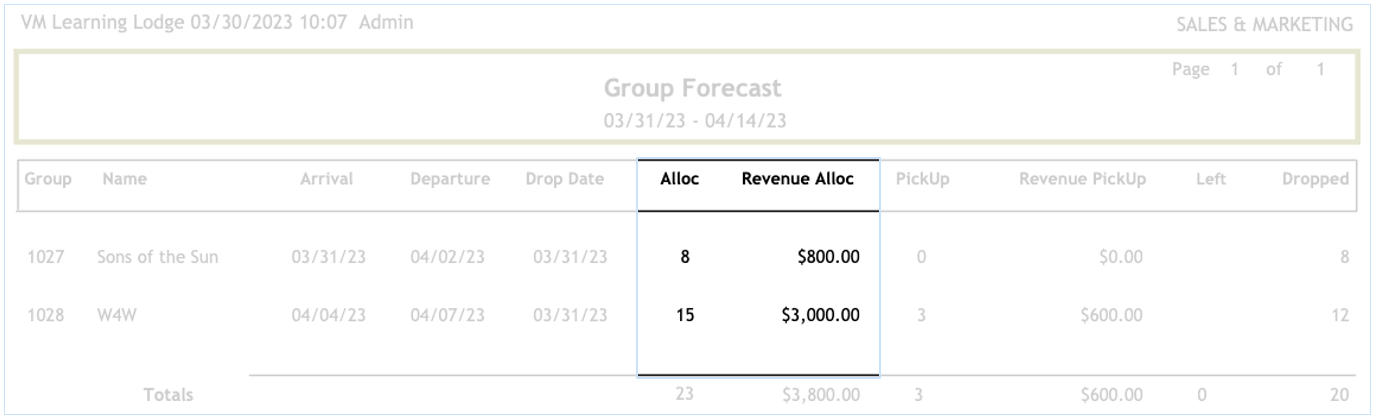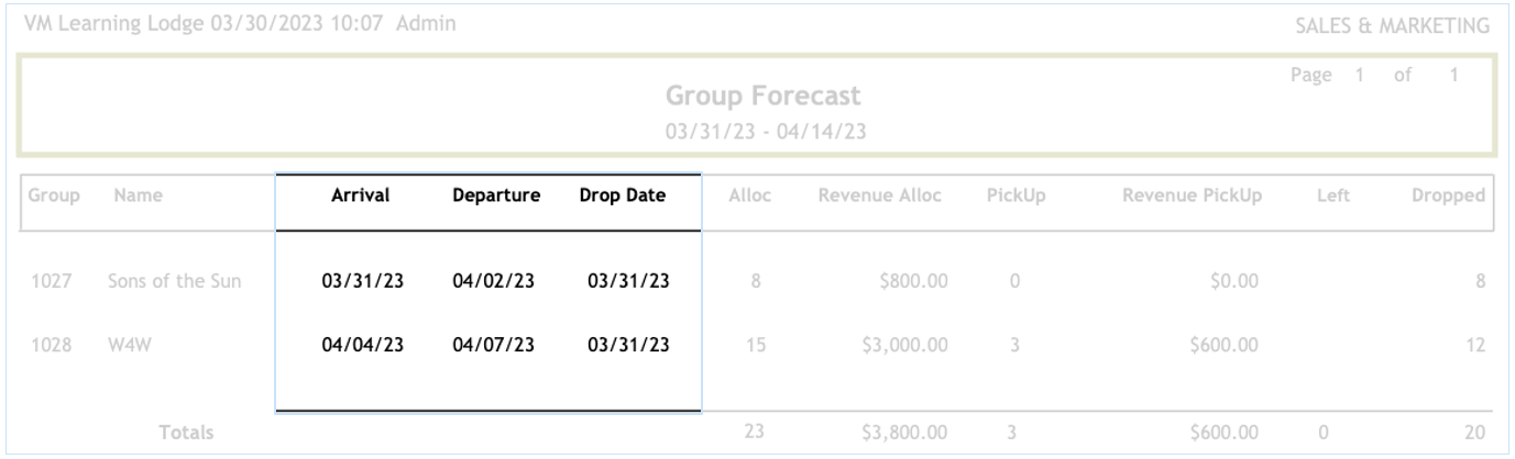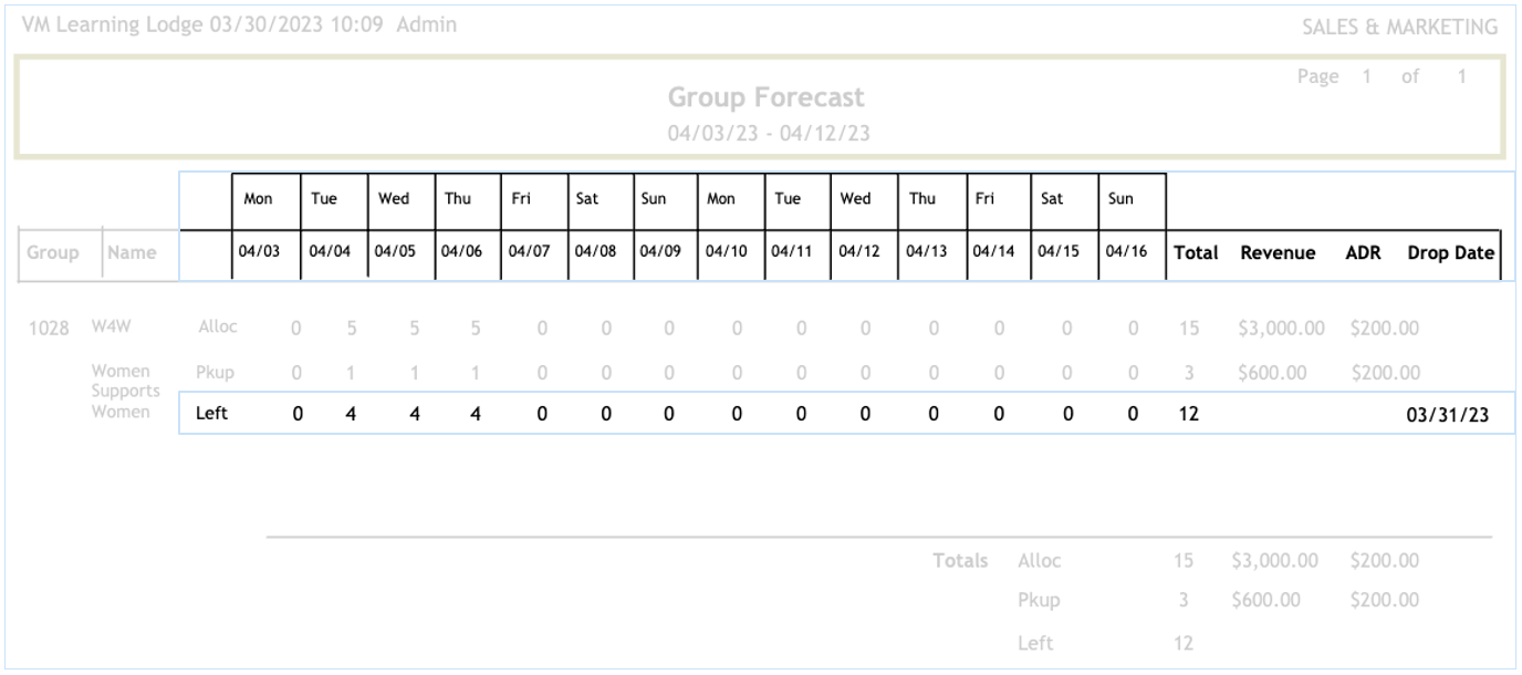 The Group forecast report will display a recap of each group currently booked in the system.