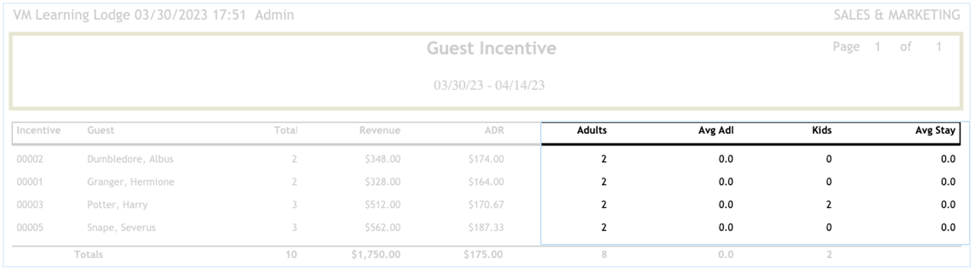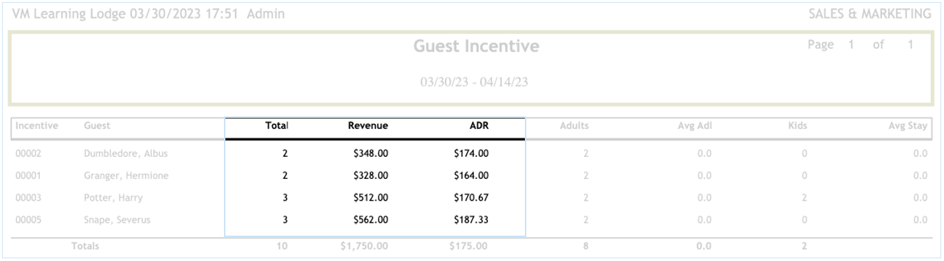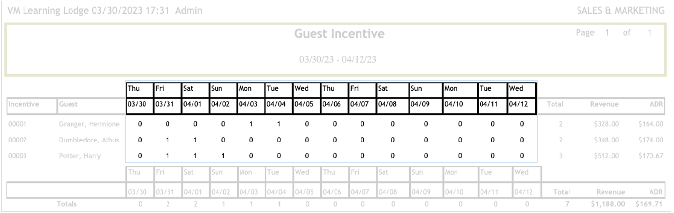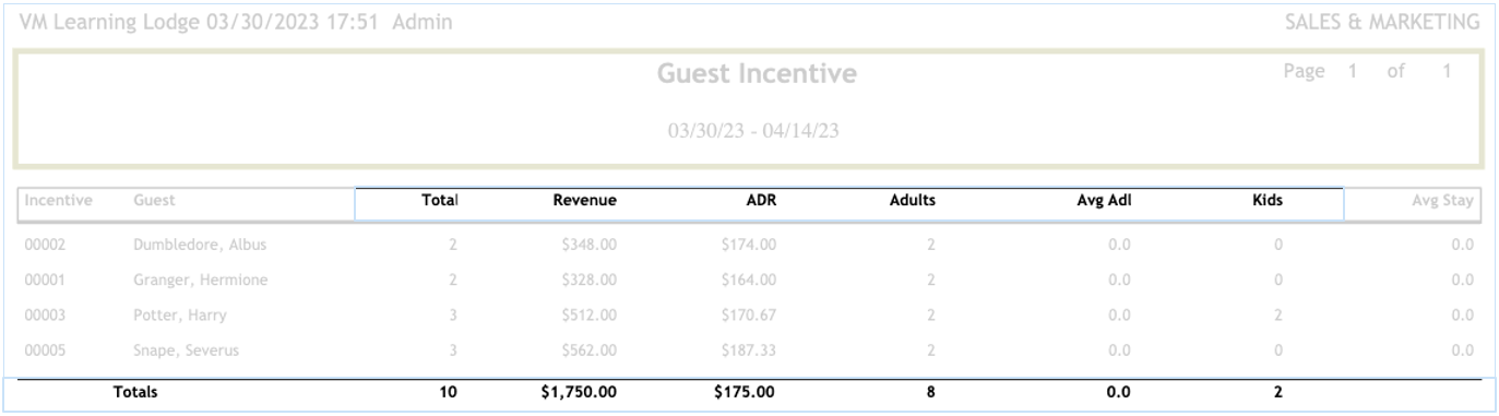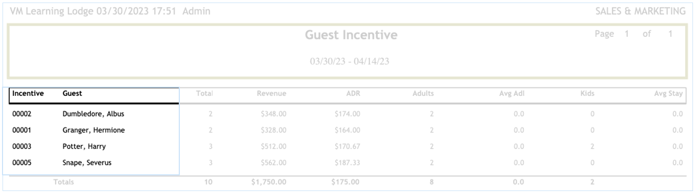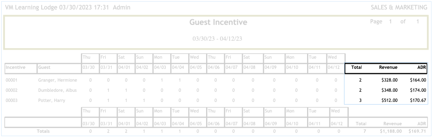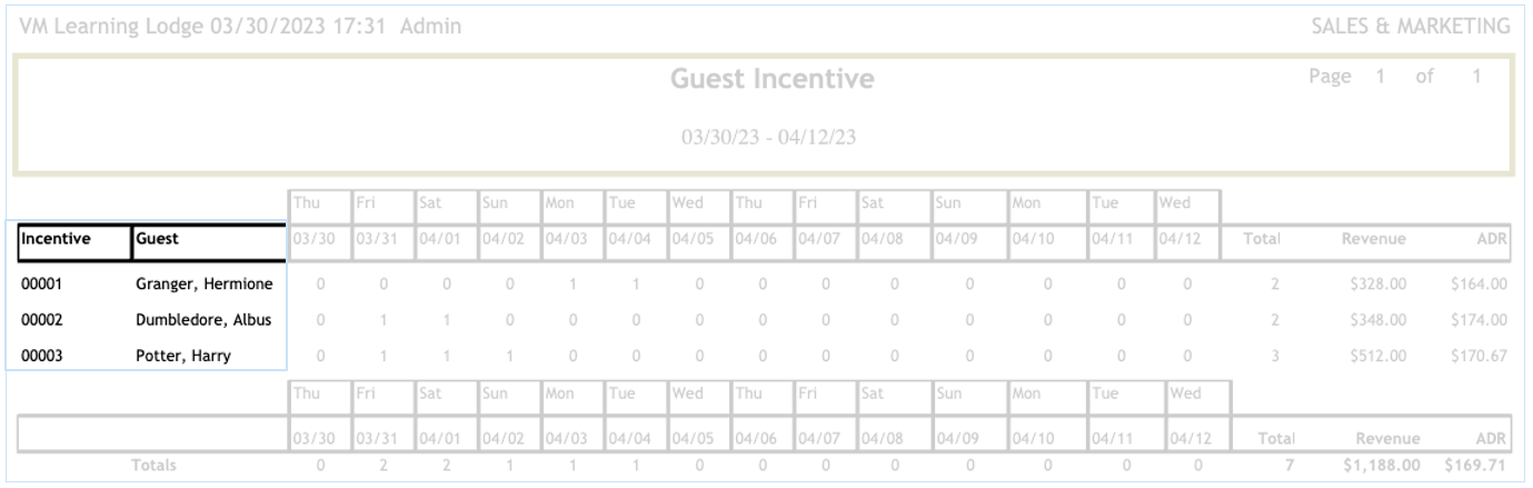 The Guest Incentive forecast report will display a recap of Guests that are assigned an incentive number in their profile and have booked a reservation. It is like tracking VIP guests but more precisely.