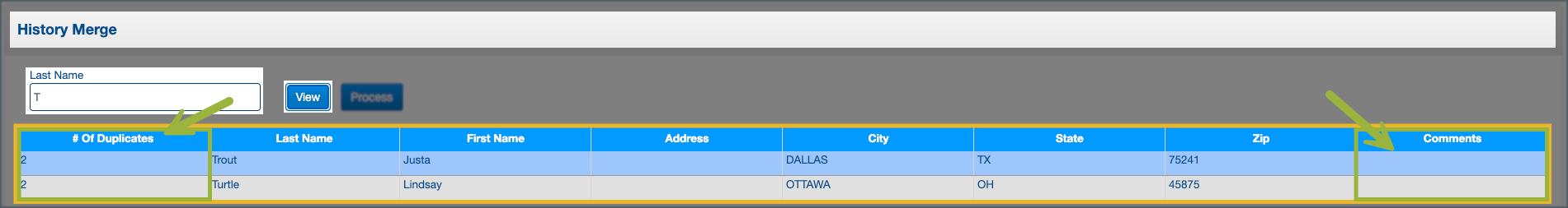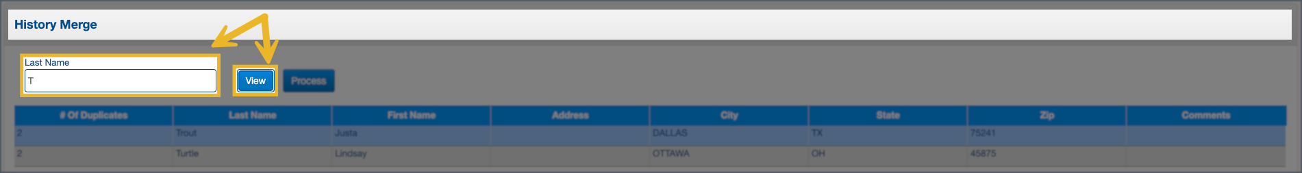 1. In the Last Name field, type at least the first letter of the guest’s last name, and click View to display potential duplicate profiles.