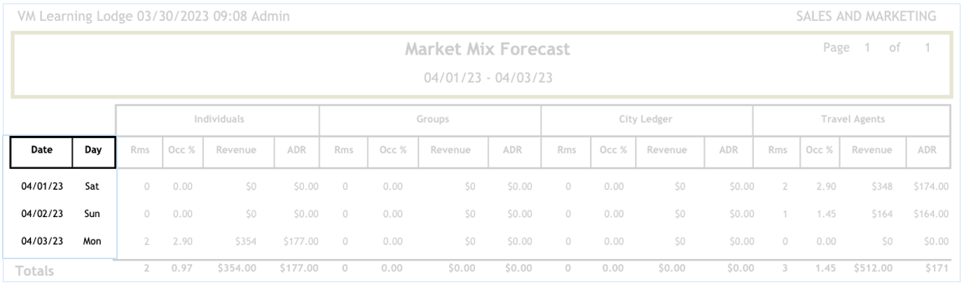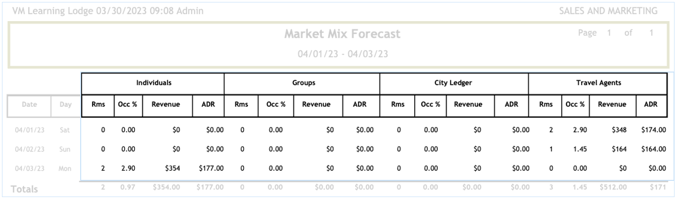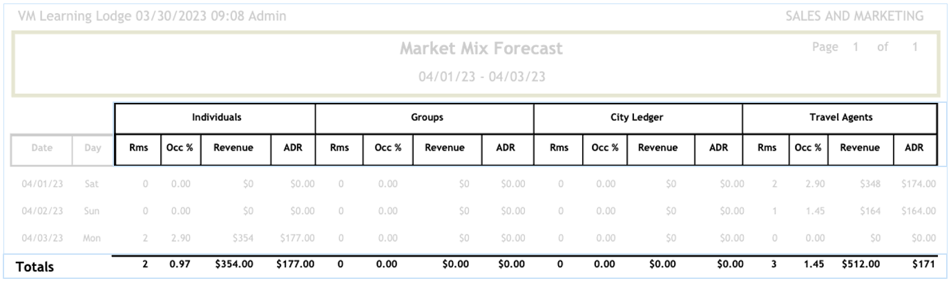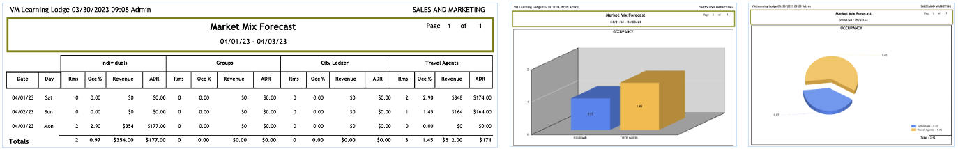 The Market Mix forecast report will show a categorization of your market by individuals, groups, city ledger or travel agents. Data is based on every reservations currently in the system.