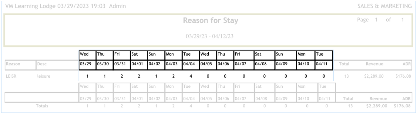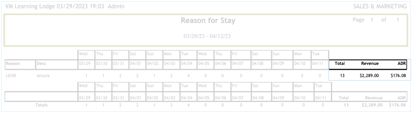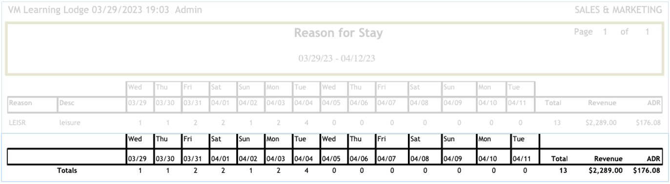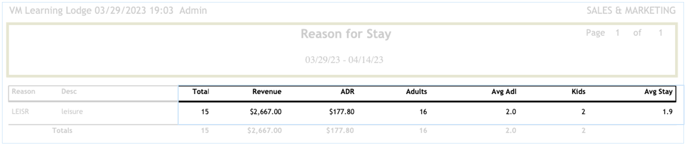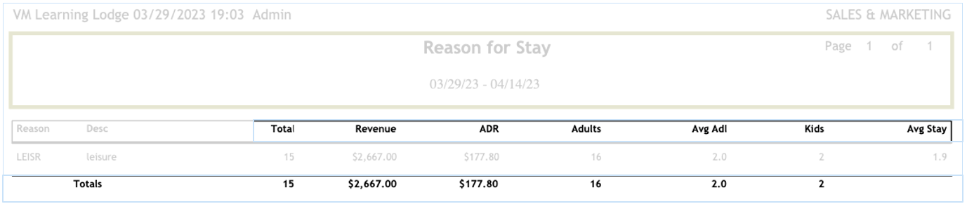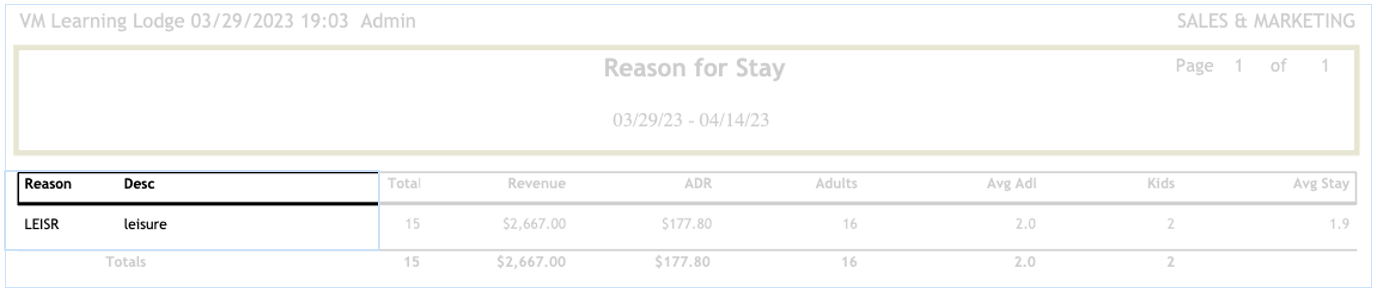 ? Watch Video The Reason for Stay History report will display the number of rooms, revenue generated and ADR for each Reason for Stay. The Reasons for Stay are marketing segments that are setup in "Sales & Marketing > Setup > Reason for Stay". Path: ...
