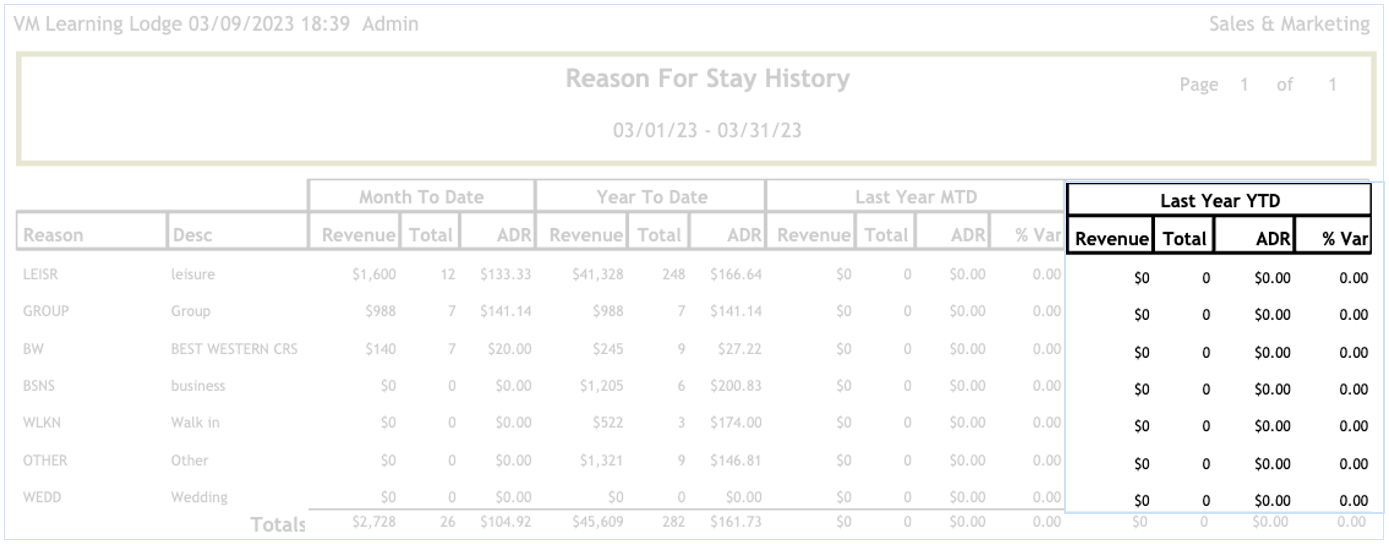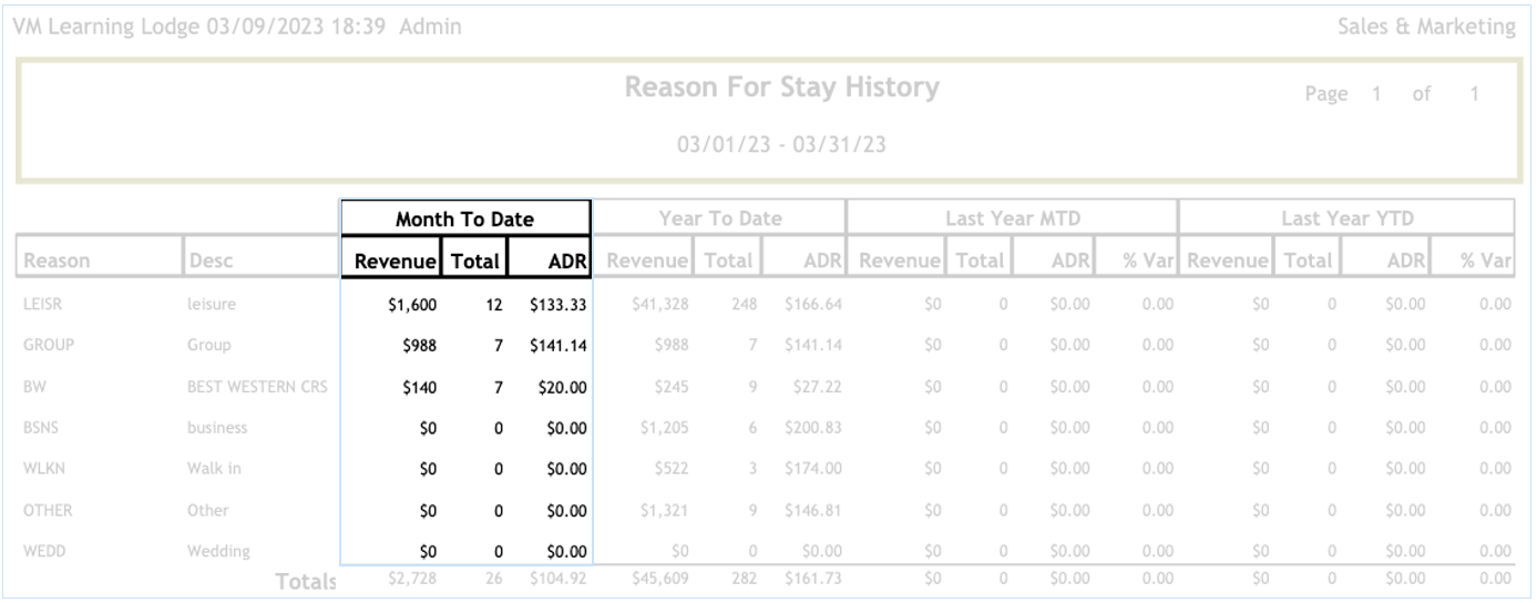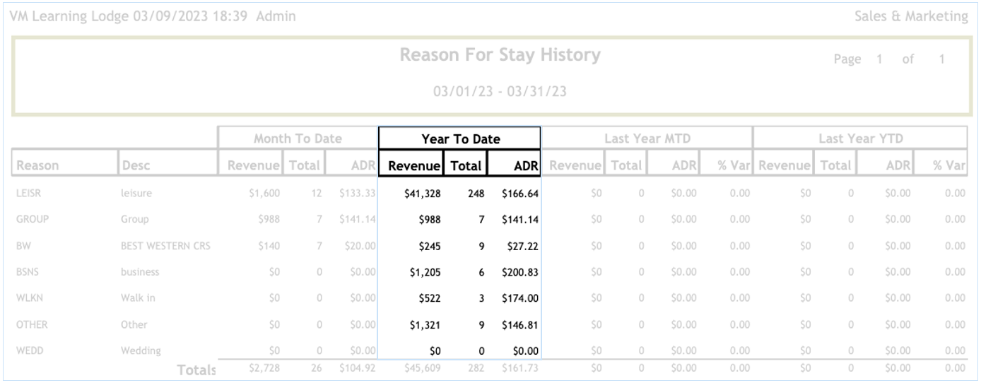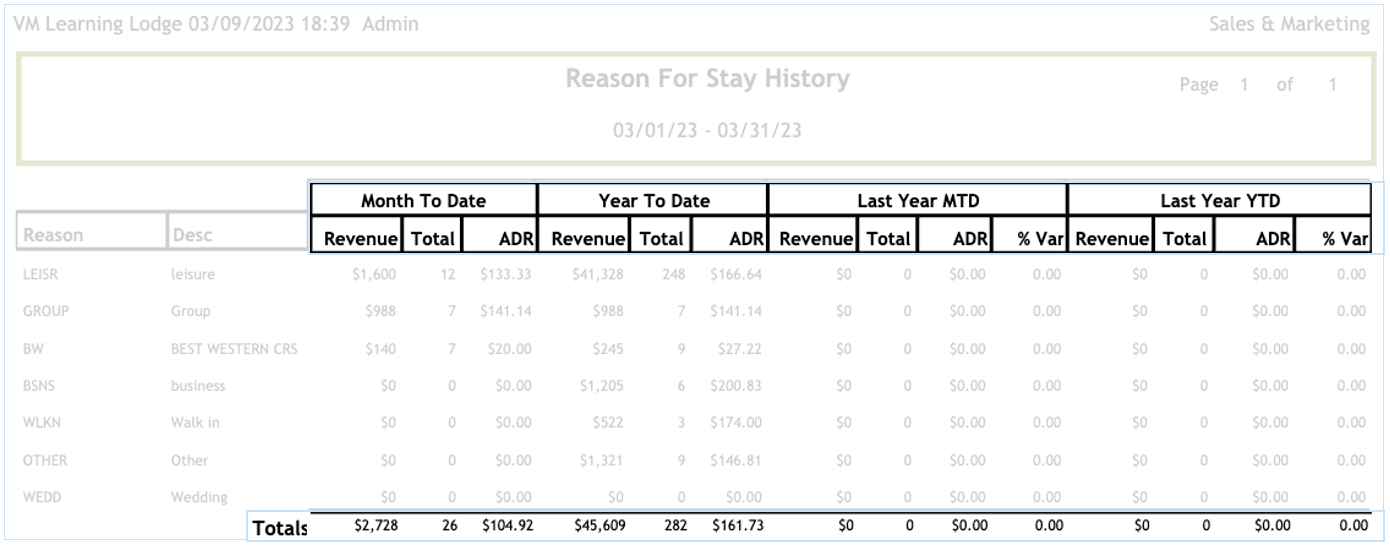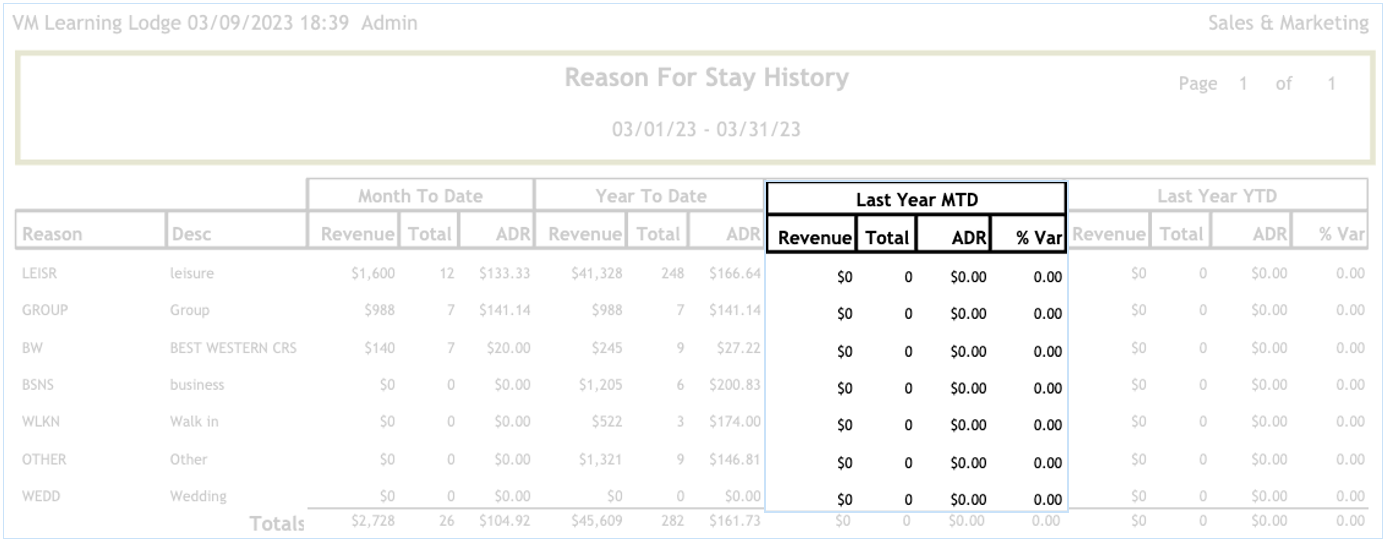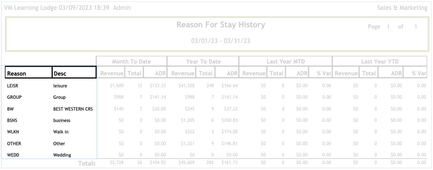 The Reason for Stay History report will display the number of rooms, revenue generated and ADR for each Reason for Stay. The Reasons for Stay are marketing segments that are setup in "Sales & Marketing > Setup > Reason for Stay".