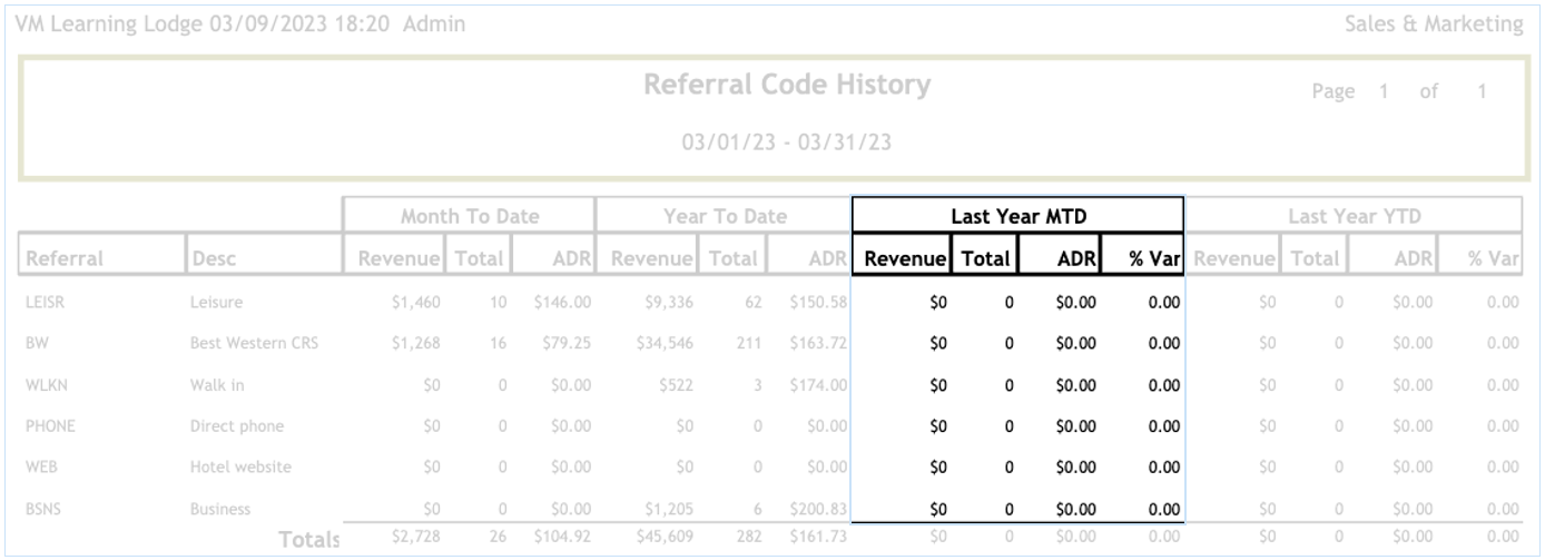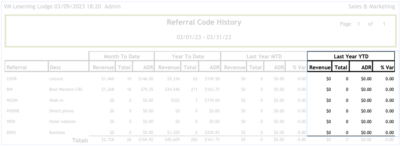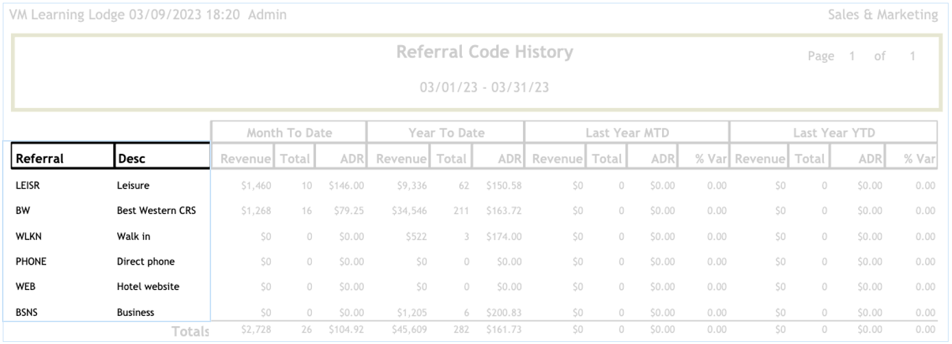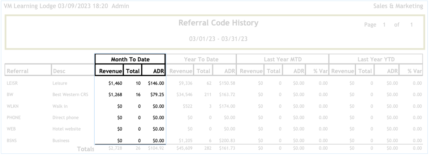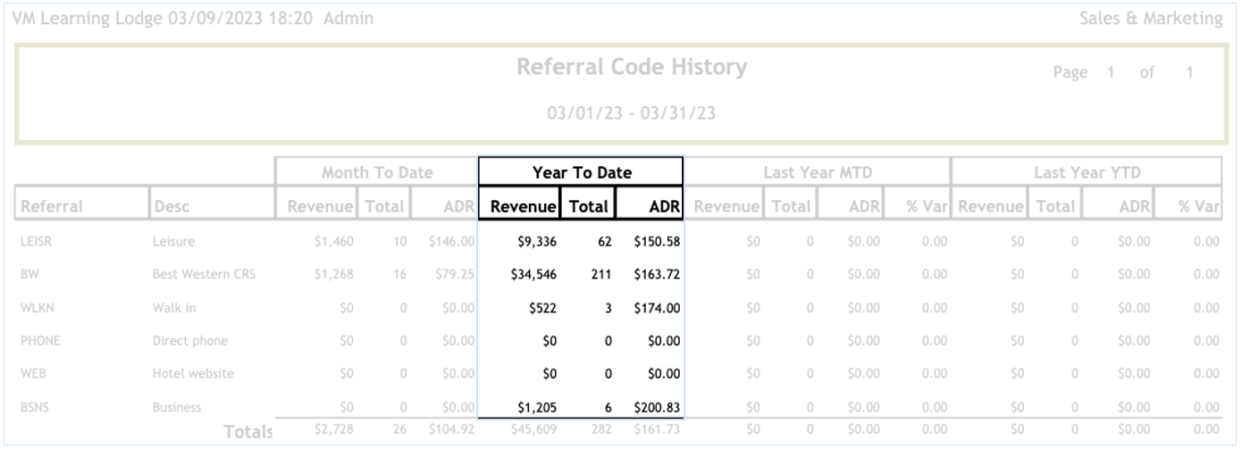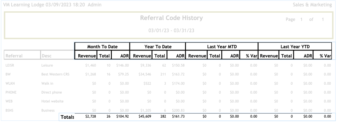 The Referral Code History report will display the number of rooms, revenue generated and ADR for each Referral Code. The Referral Codes are marketing segments that are setup in "Sales & Marketing > Setup > Referral Codes".