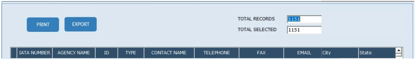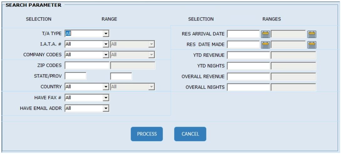 In the Sales and Marketing database, a collection of data is provided for the Travel Agent/Agency. Examples of some available filters are as follows: IATA#, Zip Codes. The created list can be printed or exported to allow for possible label printing or email transmission.