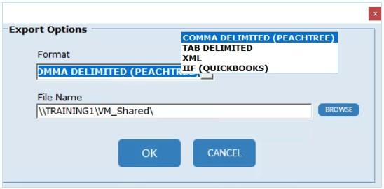 5. Choose the Format you want for the data export: Comma Delimited (PeachTree), Tab Delimited, XML or IIF (Quickbooks).
