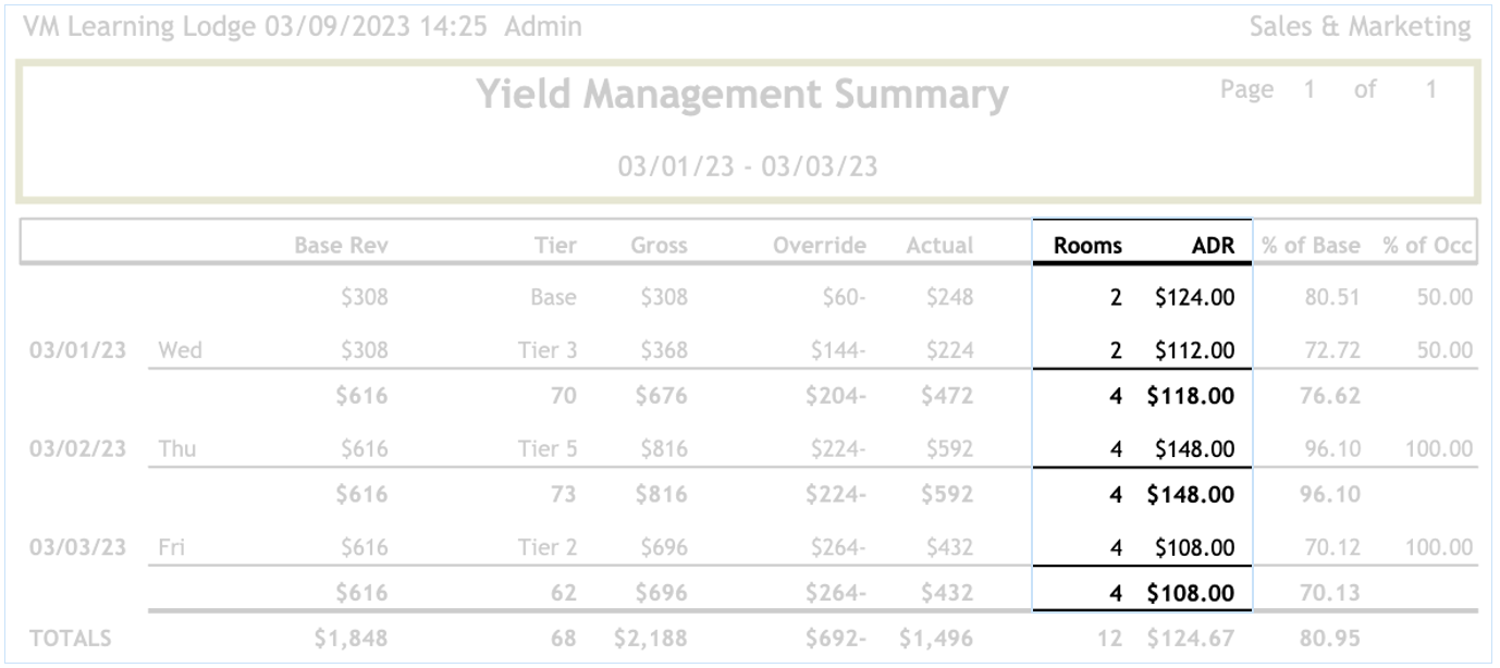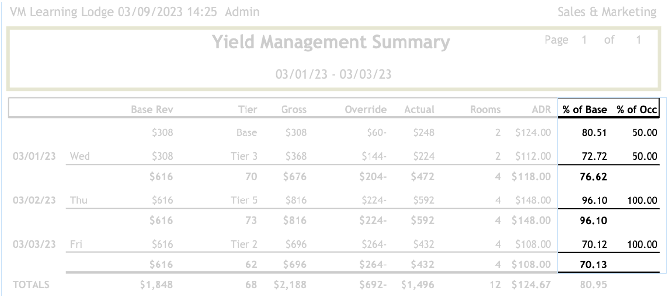 - % of base: (ADR for this tier this day) / (applicable base rate) x 100. The % of base compares the ADR for that tier that day with the base rate ADR. Closer the number is to 100%, less overrides and discounts have been applied.