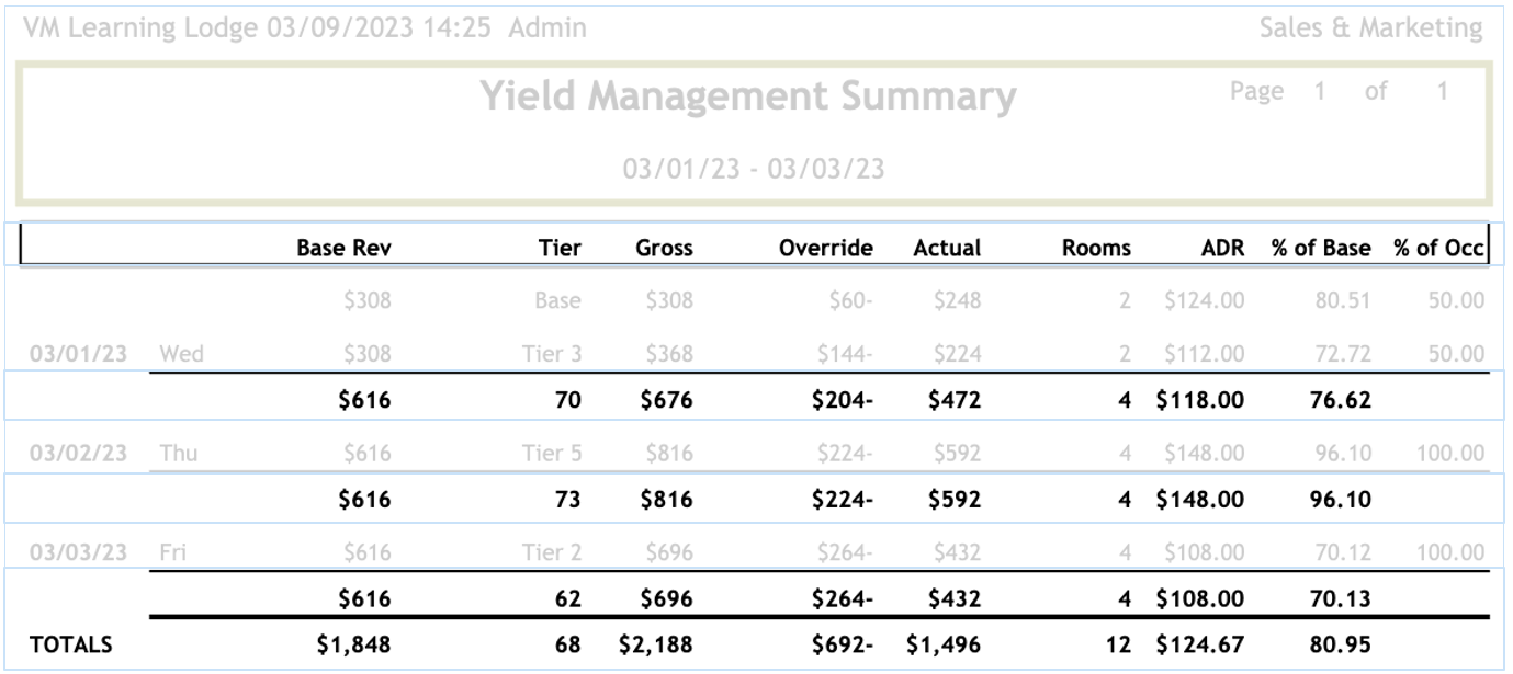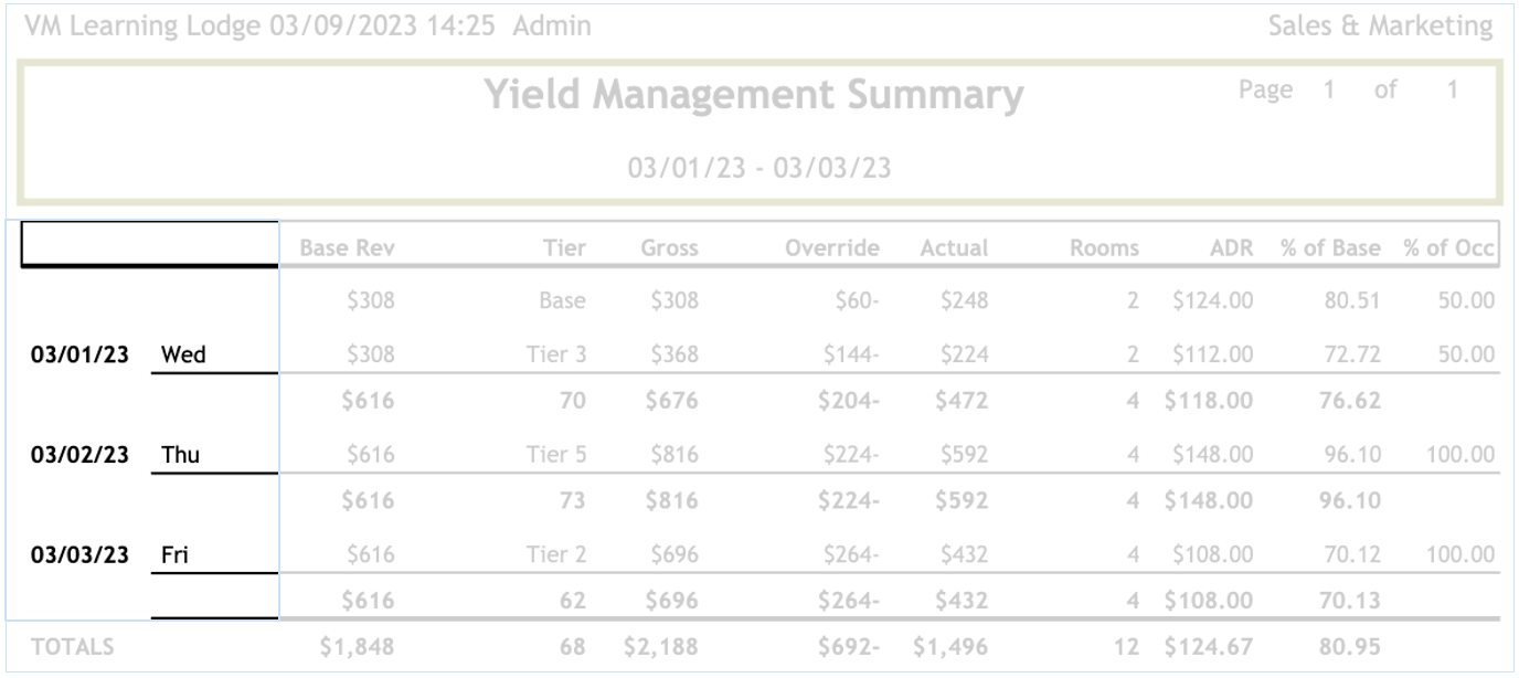 Path: Sales & Marketing > Reports > History > Yield Mgmt
