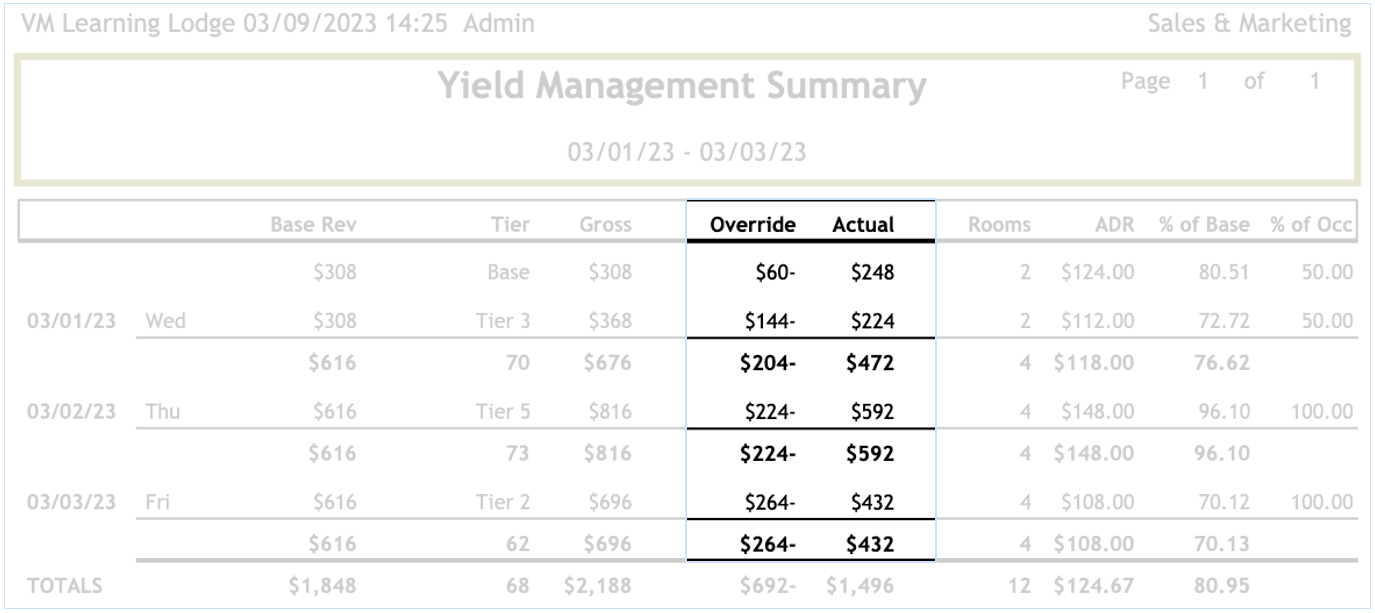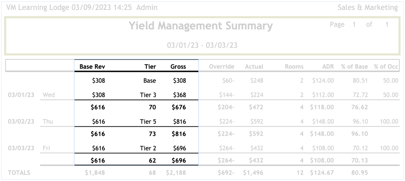 The Yield Management History report will display how many rooms were sold for each tier each day.