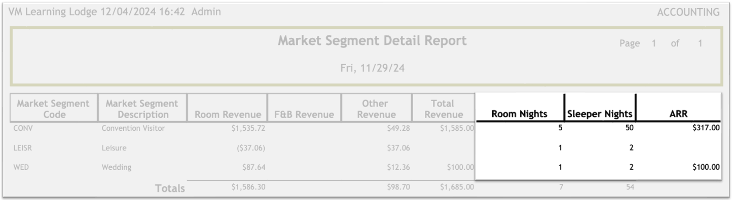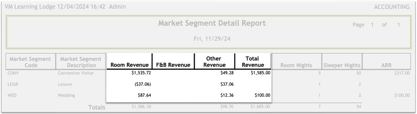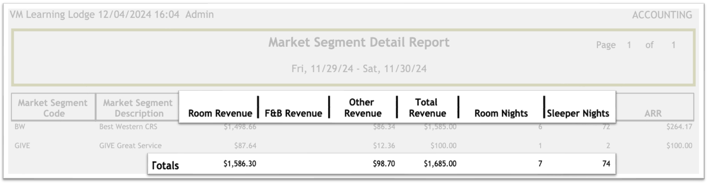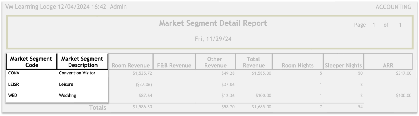 The Market Segment Detail Report offers a detailed analysis of revenue performance for specific market segments within a chosen date range. It includes data on various revenue streams, such as room revenue, F&B (Food & Beverage) revenue, and other sources of income. This report enables users to assess the financial performance and activity of each market segment, including total room nights and sleeper nights.