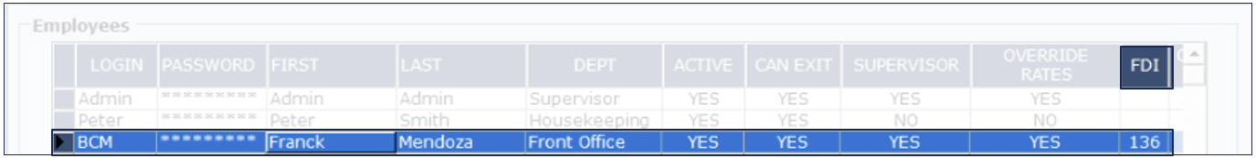 The employee FDI is the Front Desk Incentive number, the employee’s 3-digit enrollment number in the BWI system. The number is issued by BWI and must be saved to the user’s data.